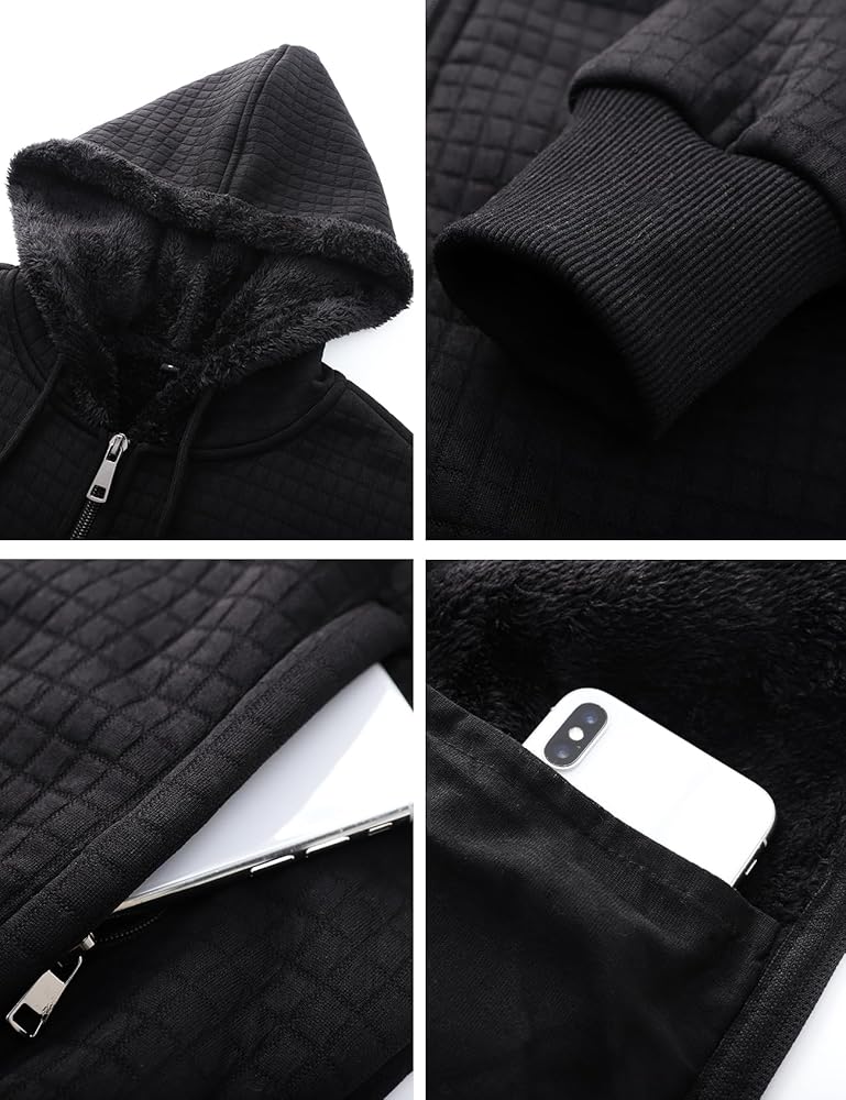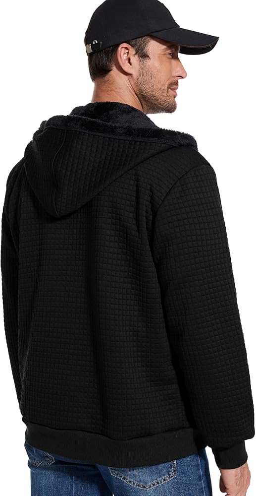 Mens Fleece Hoodie Jacket Material Shell: Jacquard plaidcloth textured fabric; Lining: Fleece lining all over, including sleeves and hooded, heavyweight jacket, super soft and warm, durable enough for cold weather.