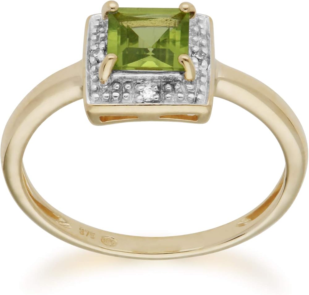This ring is made with certified genuine gemstones, featuring a 0.6 carat August birthstone, square cut peridot with a size of 5x5 mm supported with four round natural diamonds.