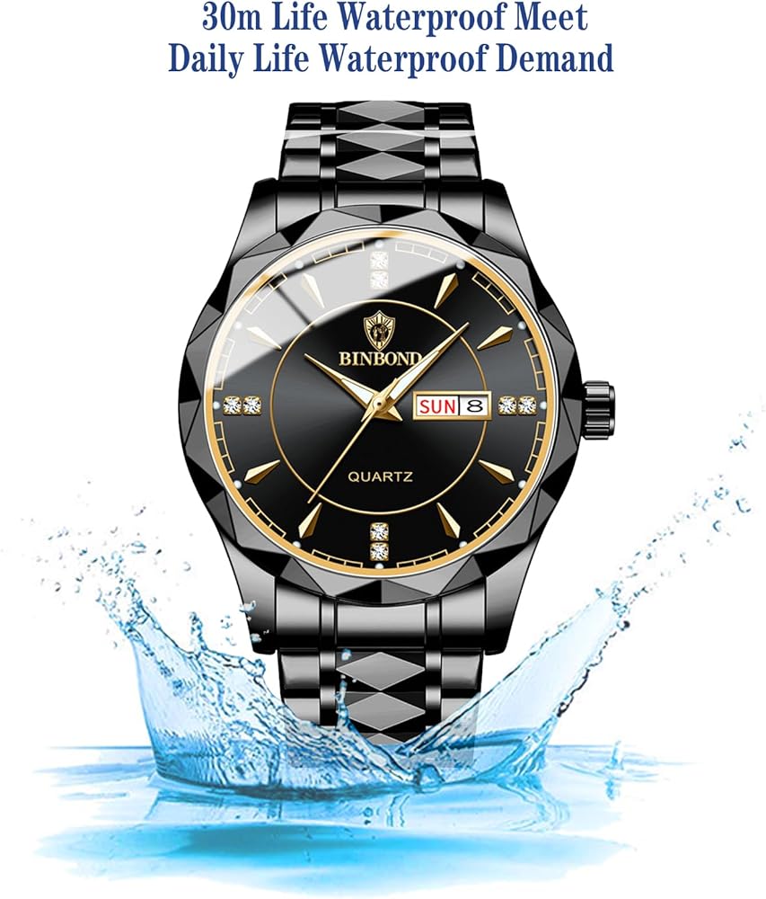 Stainless steel / Calendar /Waterproof FUNCTION : Calendar is easy to read./ The watch band is easy to adjust / shockproof,dress watch,/ water resistant up to 3 ATM - 30 meters - 100 feet, handwash,swimming,daily use waterproof,not suitable for underwater activities.Pls DO NOT press any buttons in the water,in case of damaging waterproof ring,pls keep it away from steam and hot water