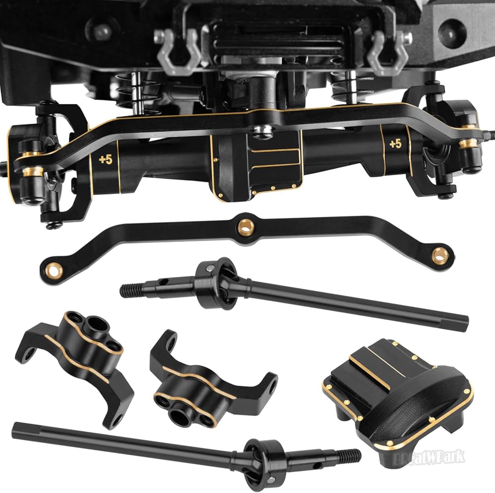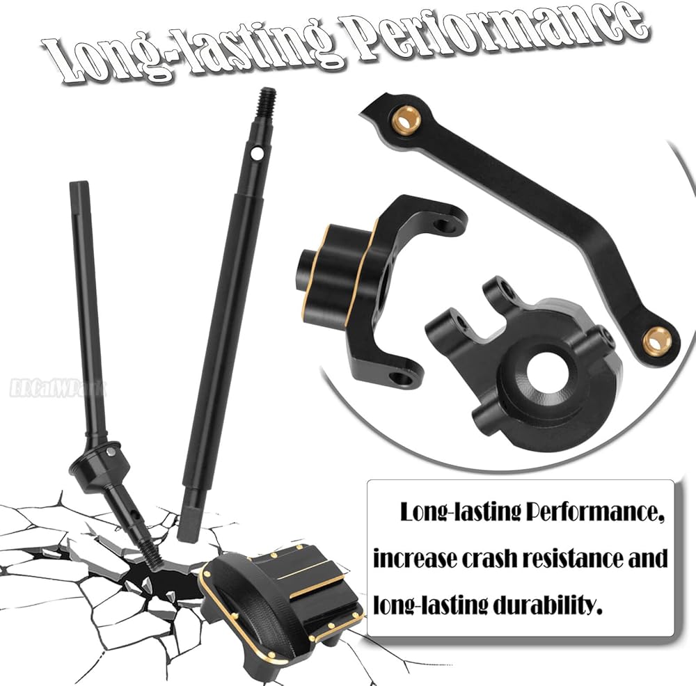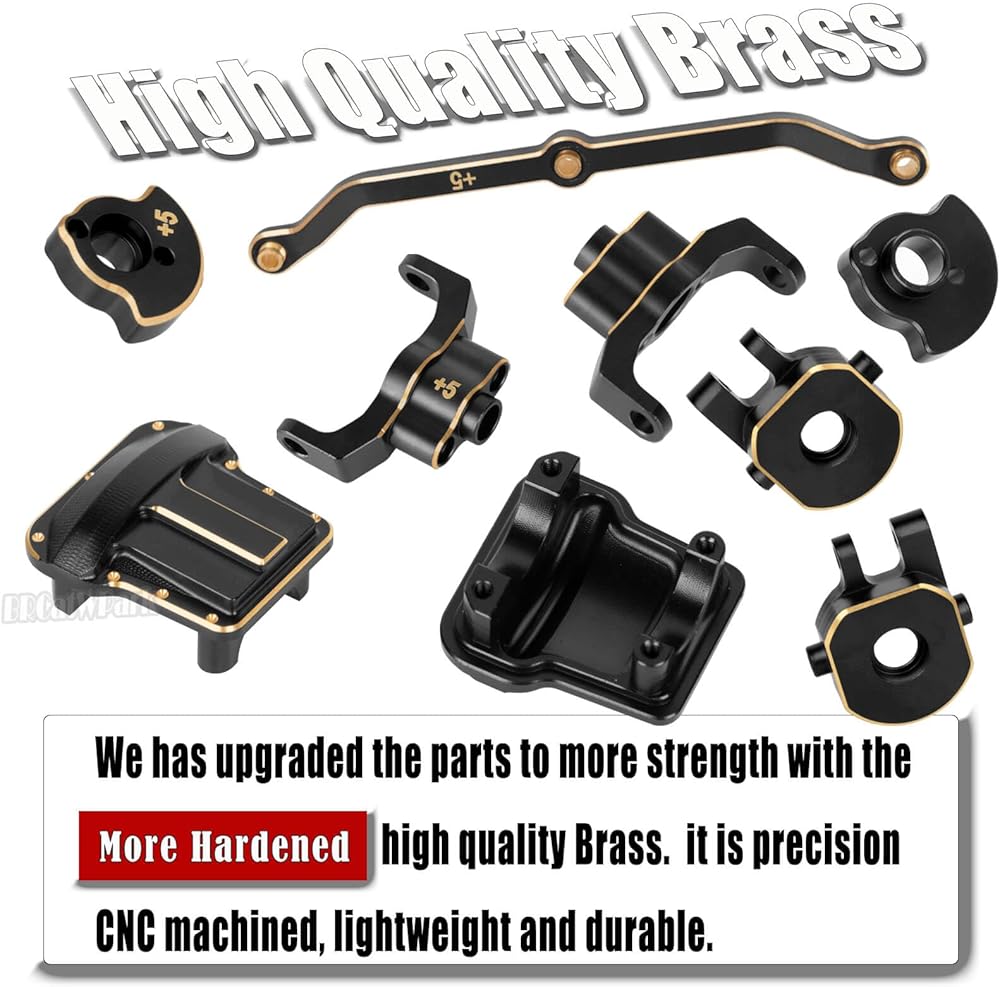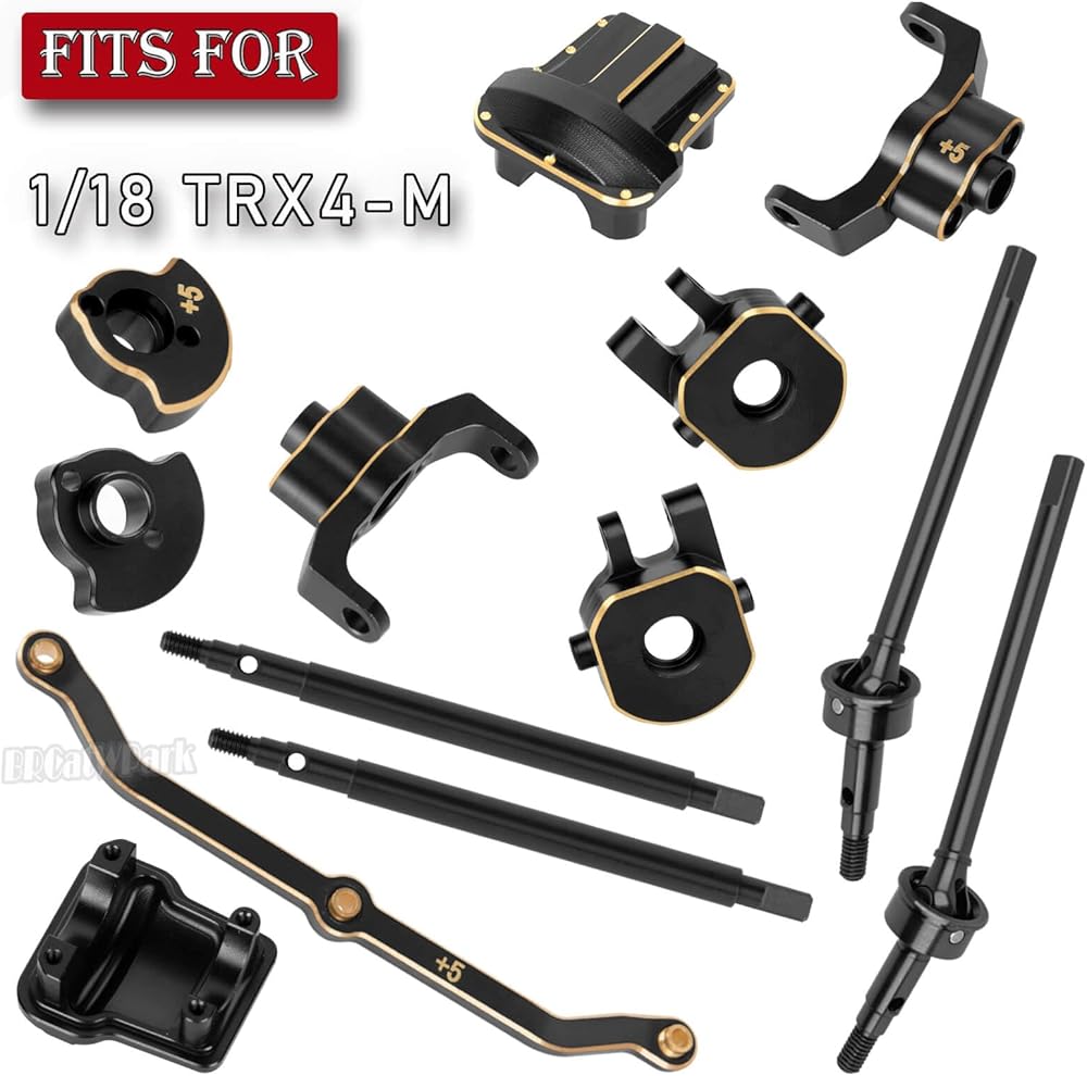 【What You Get】:2 x Brass C-Hubs +5mm Length,1 set Brass Knuckles,2 x Brass Widening upgrade Parts for Rear Axle +5mm,1 x Brass steering link +10mm,2 x Front & Rear Drive Shaft for TRX4M +5mm Length,1 set front & rear Axle covers,also comes with bearings & screws for easy install.