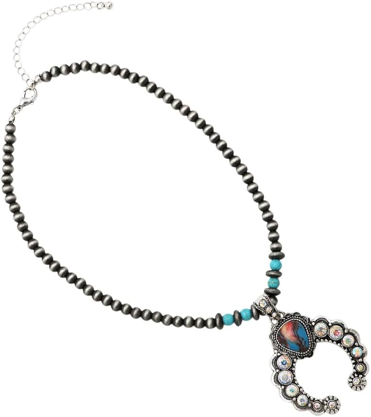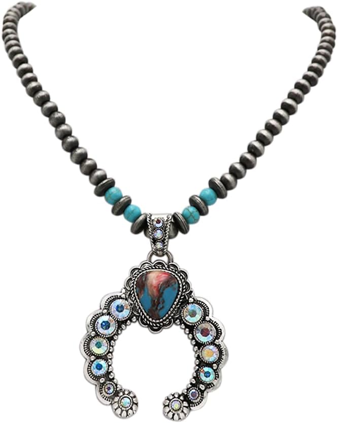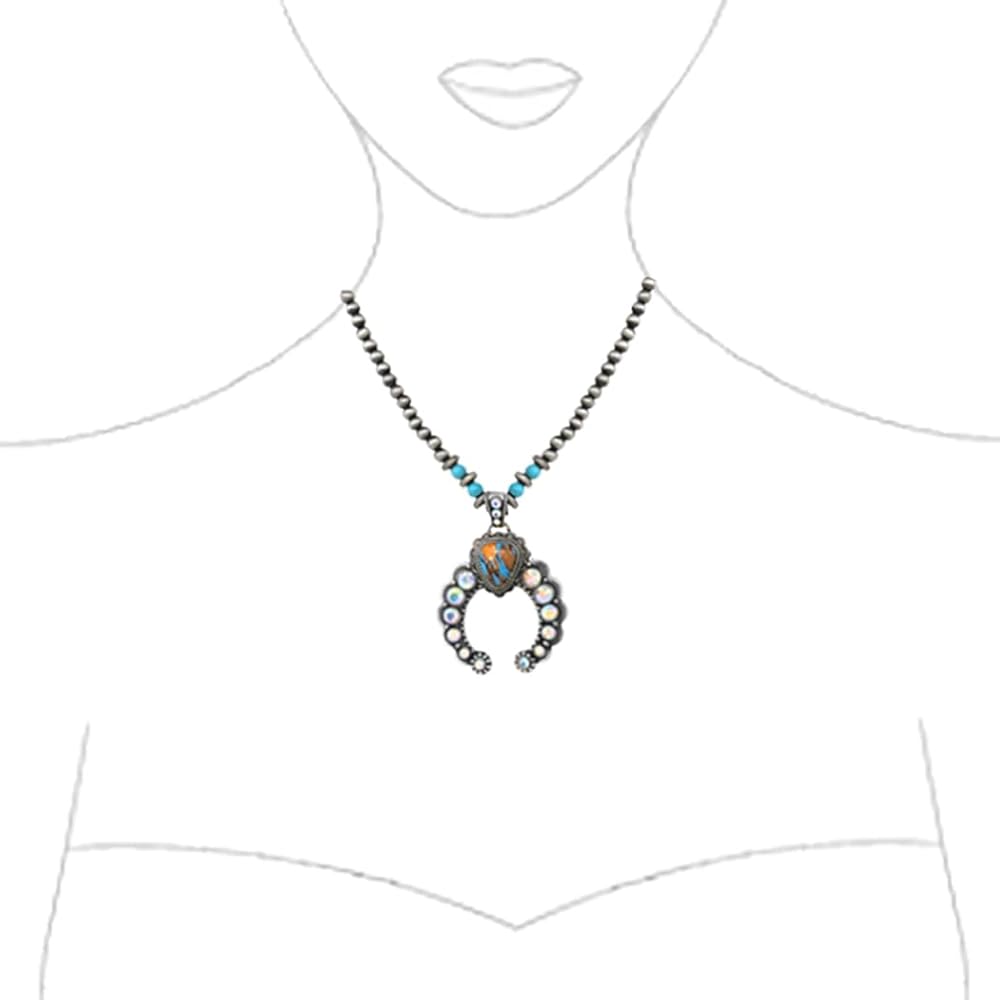 Who says a cowgirl can't be glamorous? Bring some bright and bold style to your accessory collection! No western style wardrobe would be complete without at least one statement piece of natural stone jewelry! The squash blossom is inspired by Navajo symbolism, spiritual in nature, the crescent moon (naja) was said to ward off bad spirits and is a prototypical symbol of most notably the Navajo tribe. Stunning AB crystals give this western necklace a unique and glamorous touch!