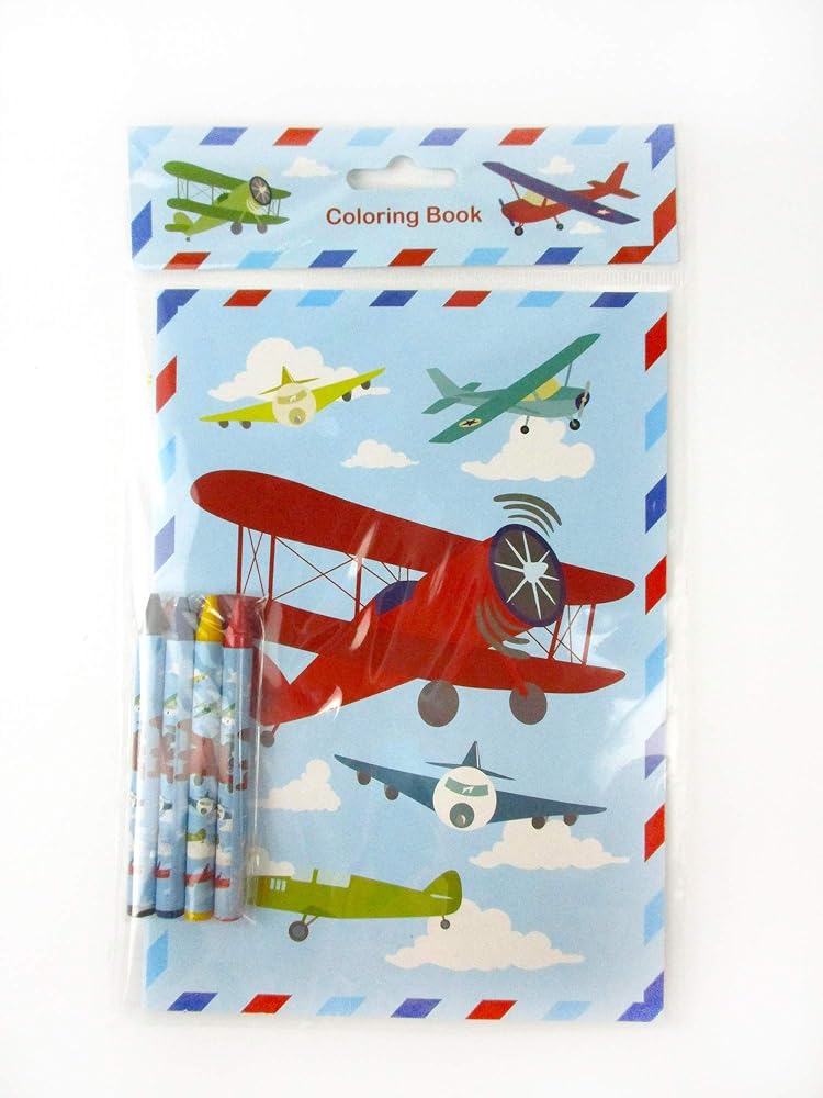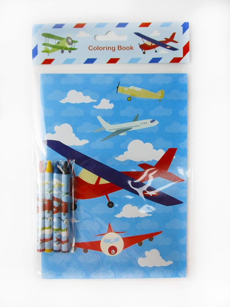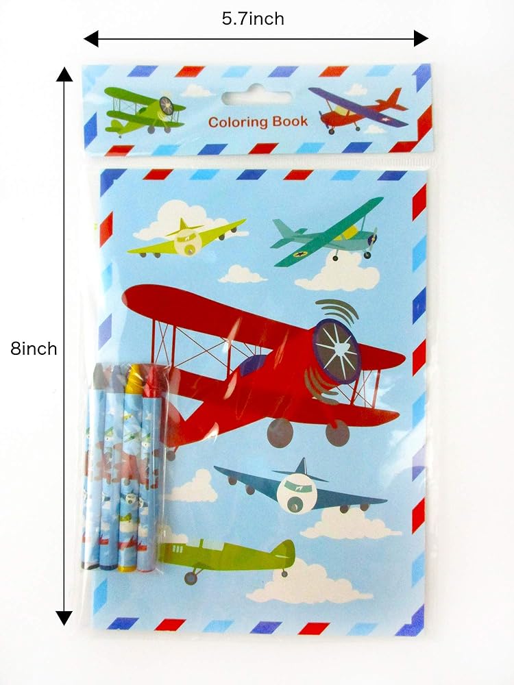 These airplane coloring books are perfect for any airplane party! Each coloring book comes with 16 pages and 4 crayons. The coloring books are compact enough for road trips, plane trips! Combine this with our airplane stampers, and our airplane party favor treat bags ready for any parties! Have these coloring books in school, at home, or in art class! Each booklet measures appx 9 inches tall, 7 inches wide