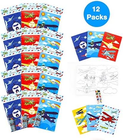 TINYMILLS Airplane Coloring Book Set with Crayons – 12 Pack Travel & Aviation Activity Books for Kids (12 Coloring Books & 48 Crayons) Airplane Birthday Party Favors, Goodie Bag Fillers