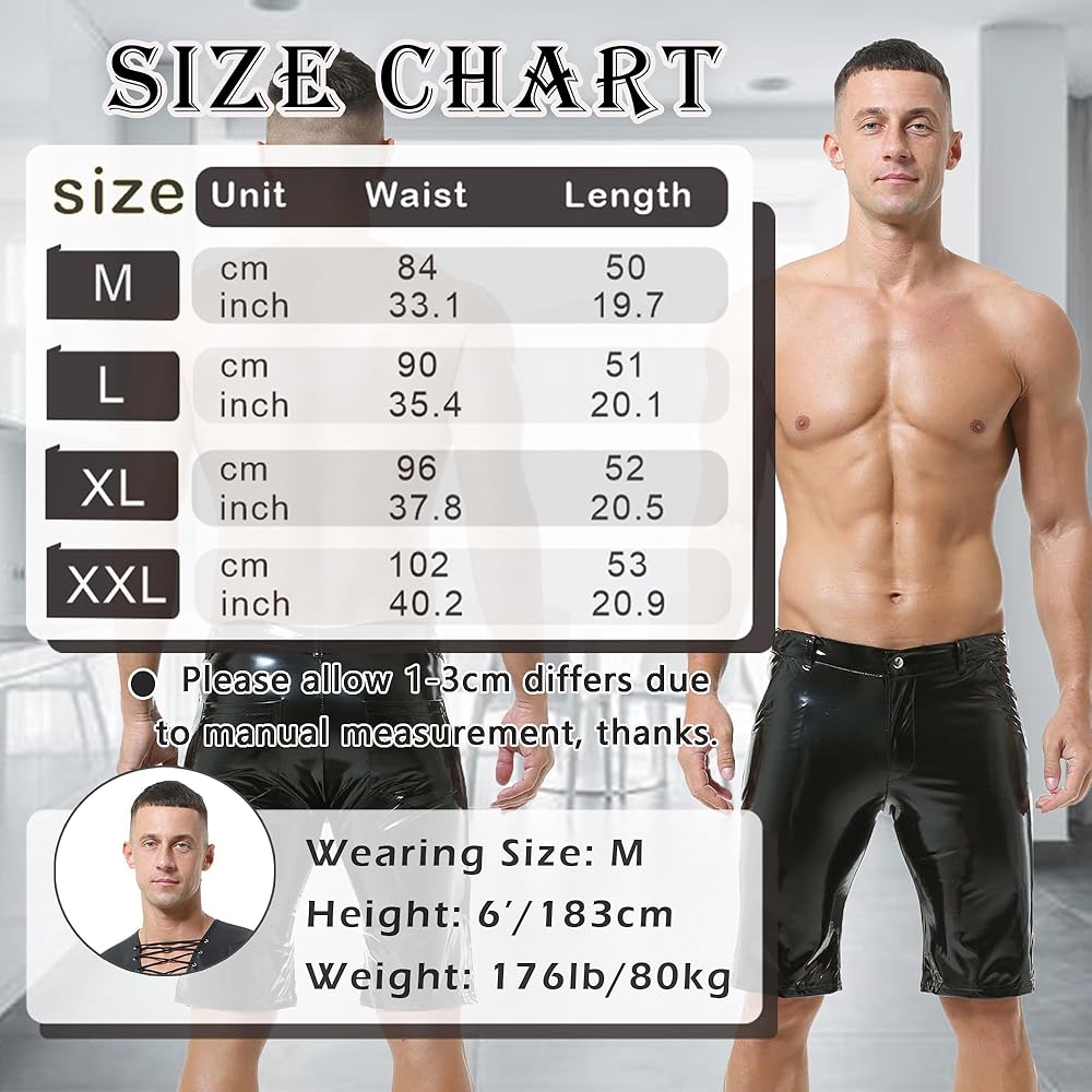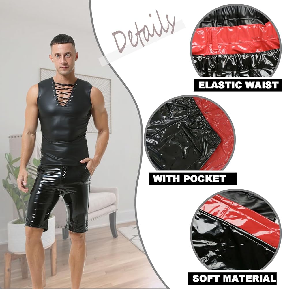 【Faux Leather Short Pants 】: This men's black leather boxer shorts are made of polyester, soft fabric, comfortable to wear. This hot shorts suit for rave, party and daily wear.
