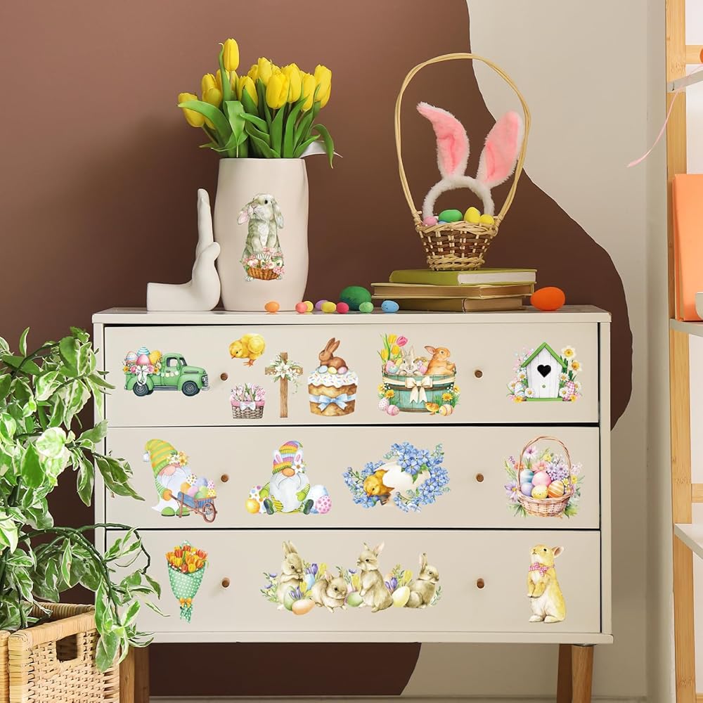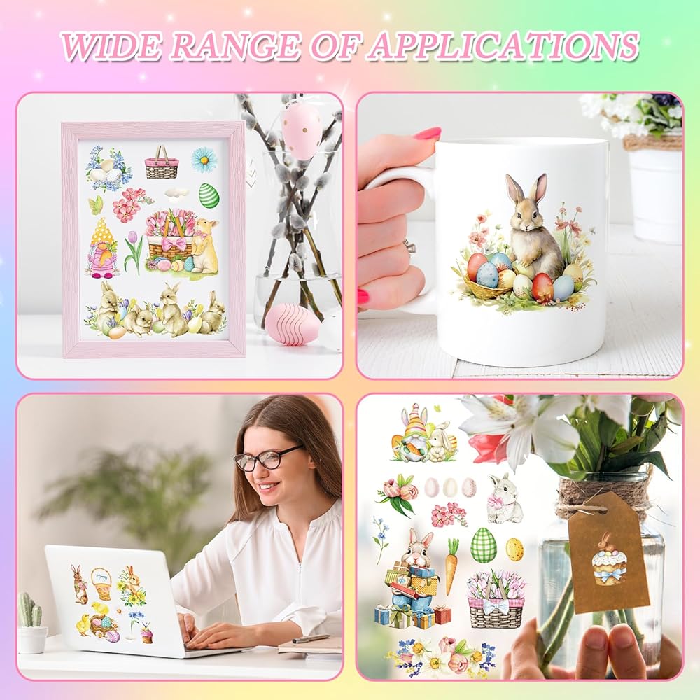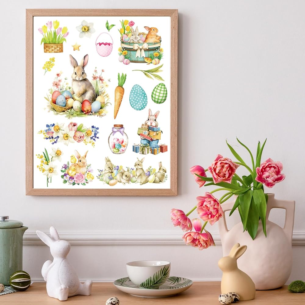 Easter Rub on Transfers for Crafts - 12 Sheets Bunny Rub on Transfers for Furniture Egg Floral Gnome Rub on Transfer Decal Stickers for Spring Easter Wood DIY Craft Home Office Decor