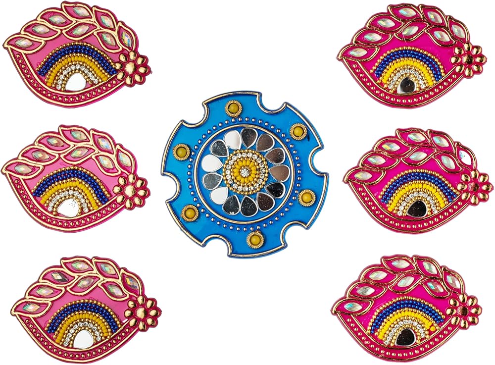 Beautiful handmade acrylic rangoli with creative design, kundan work with bright colors to decorate your home entrance beautifully. This rangoli can also be pasted on the wall to decorate your living room walls.
