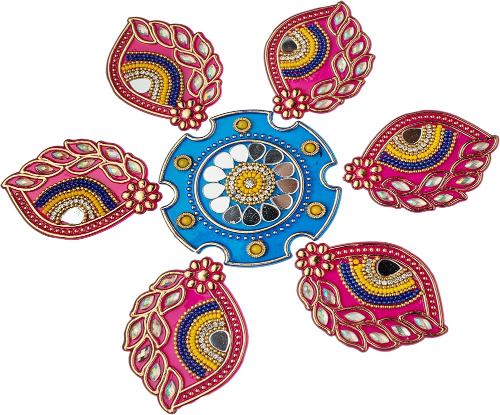 Product :- Floor Rangoli Material :- Acrylic Kundan & Stone Size :- 8" Diameter Color :- Pink + Blue