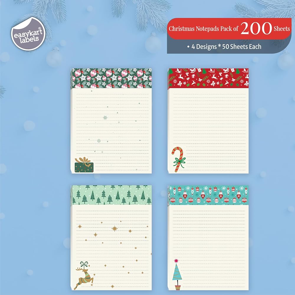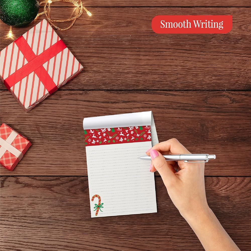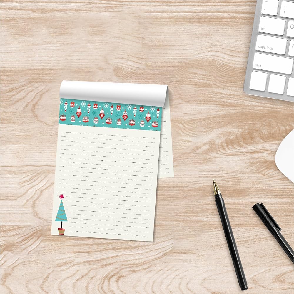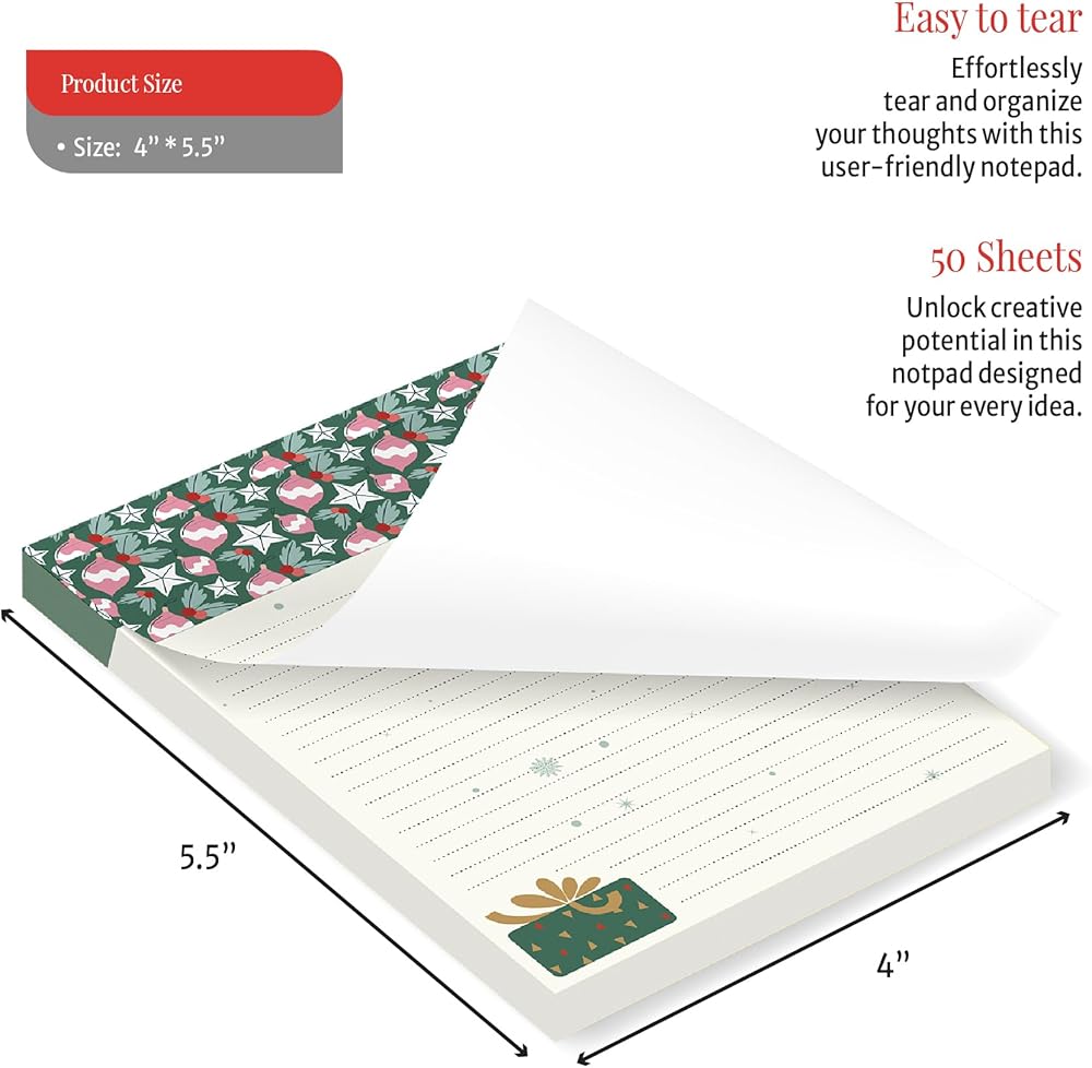 Package Includes: Revel in the holiday spirit with 4 charming holiday notepads. Each pad features 50 sheets, perfectly sized at 4.0" x 5.5". Designed with practicality in mind, they're conveniently glued at the top for easy us