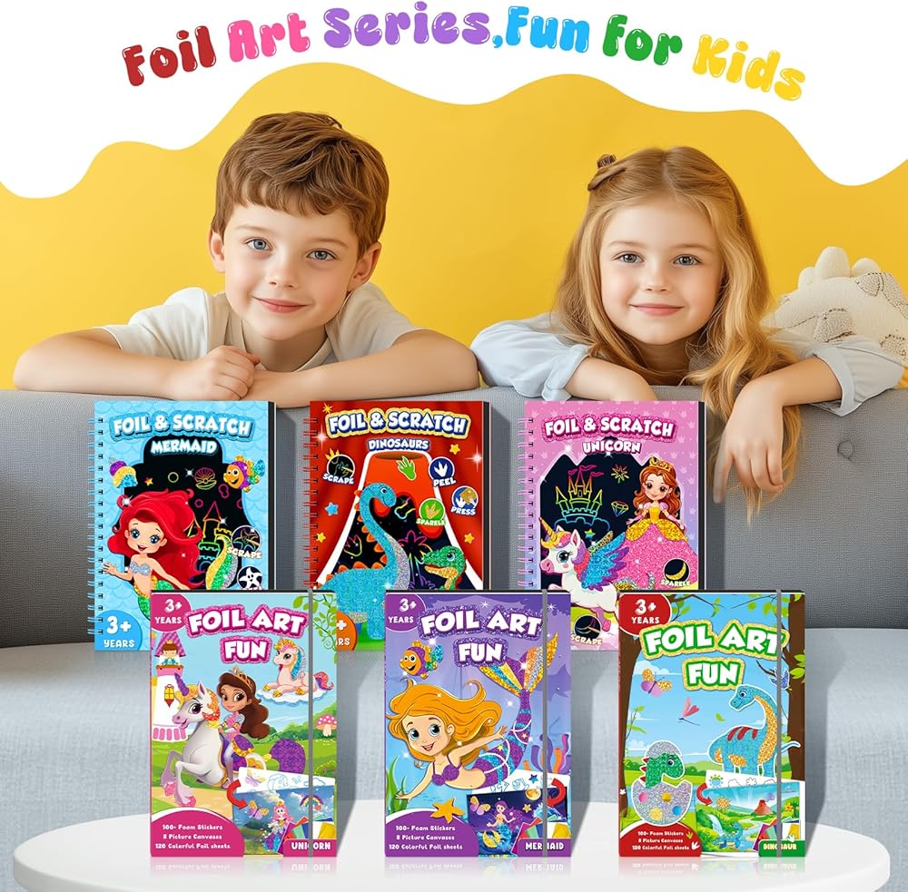 Foil Art And Craft Activities:The foil art includes 120 colorful foil sheets, 8 picture canvases, and 100+ foam stickers,50 googly eyes & instruction manual—providing plenty mess-free foil art and craft activities for kids to fully unleash their imaginations!They can creates stunning artwork featuring unicorn, princesses, fairies, and castles,sparking hours of creative play!