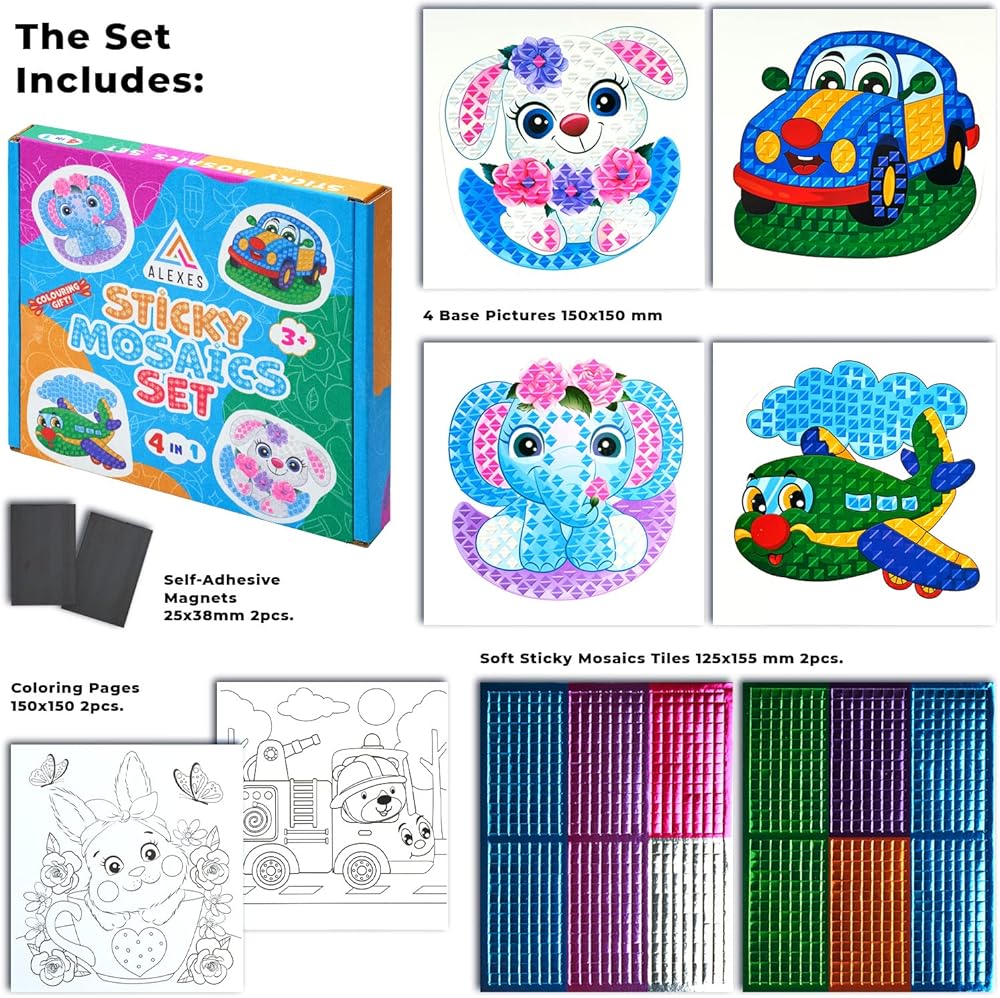 Mosaic Sticker Art Kits for Kids: We present our brand new sticky mosaic set containing 4 different pictures and a sticker palette that will help you create the most beautiful sticker art.
