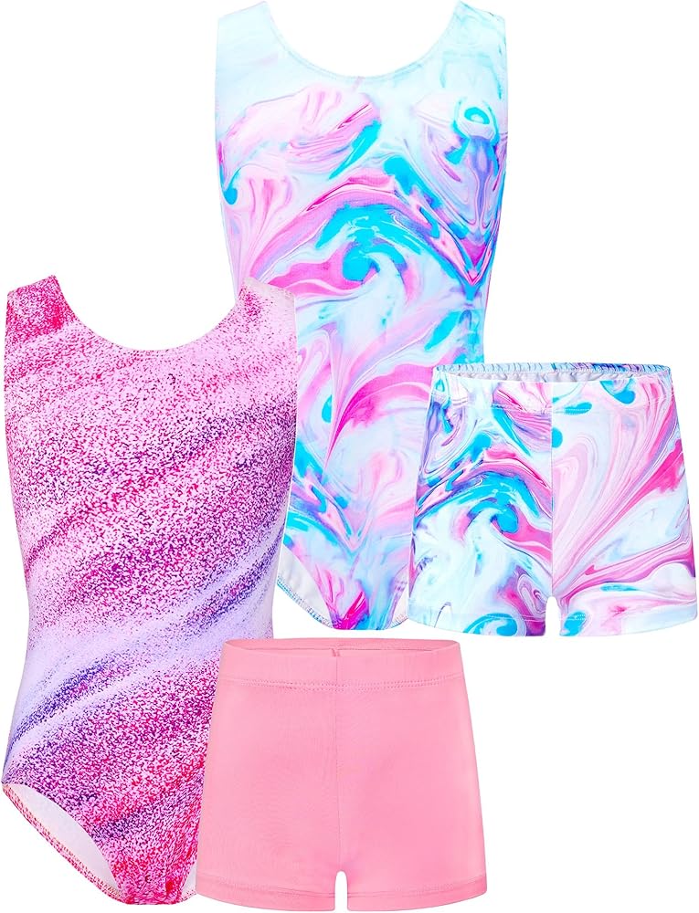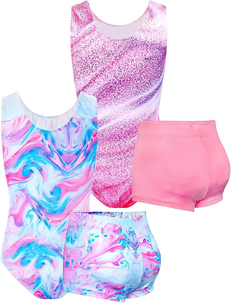 TENVDA Bundles of Gymnastics Leotards for Girls 5-6 Years Old Pink Blue Marble and Stripes Print Sleeveless Tumbling Outfit Matching Shorts Sets