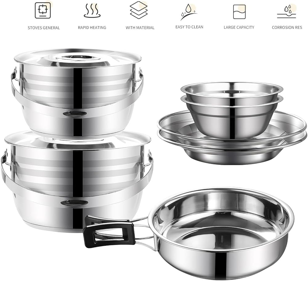 مجموعة ادوات طبخ للتخييم من الستانلس ستيل 304، مجموعة اواني ومقلاة للتخييم مع اكواب نفخ واطباق وشوك وسكاكين وملاعق للمشي لمسافات طويلة والنزهات والسفر للمغامرات لشخصين الى 4 اشخاص