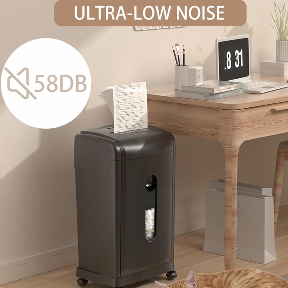 --58dB Ultra-Quiet Shredding & Durable:58 dB low noise creates the quiet and comfortable atmosphere. Also, SPCC blade can prevent 99% damages to shredder from paper jam and prolong its life span.