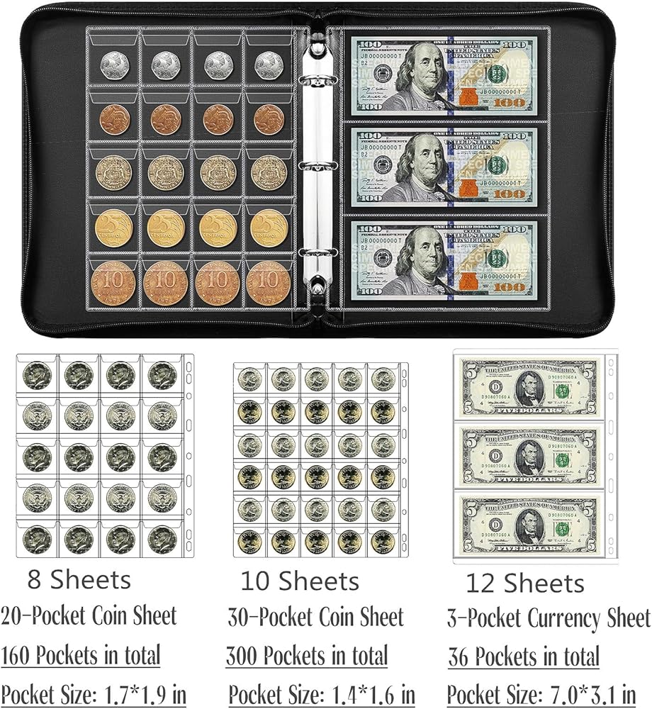 【Professional Coin & Currency Sleeves】-- ①Each coin pocket has a flap to prevent coin from falling out and sliding around. Separate pockets secure coins and bills in place, ensure protection against abrasion. ②These coin/currency collecting pages made of acid-free PVC without softener, no harm to your coins and bills, waterproof and moisture-proof. ③Both sides of the currency sheets/ coin sleeves are highly transparent, which can clearly display both sides of coin/bill for easy viewing and displaying.