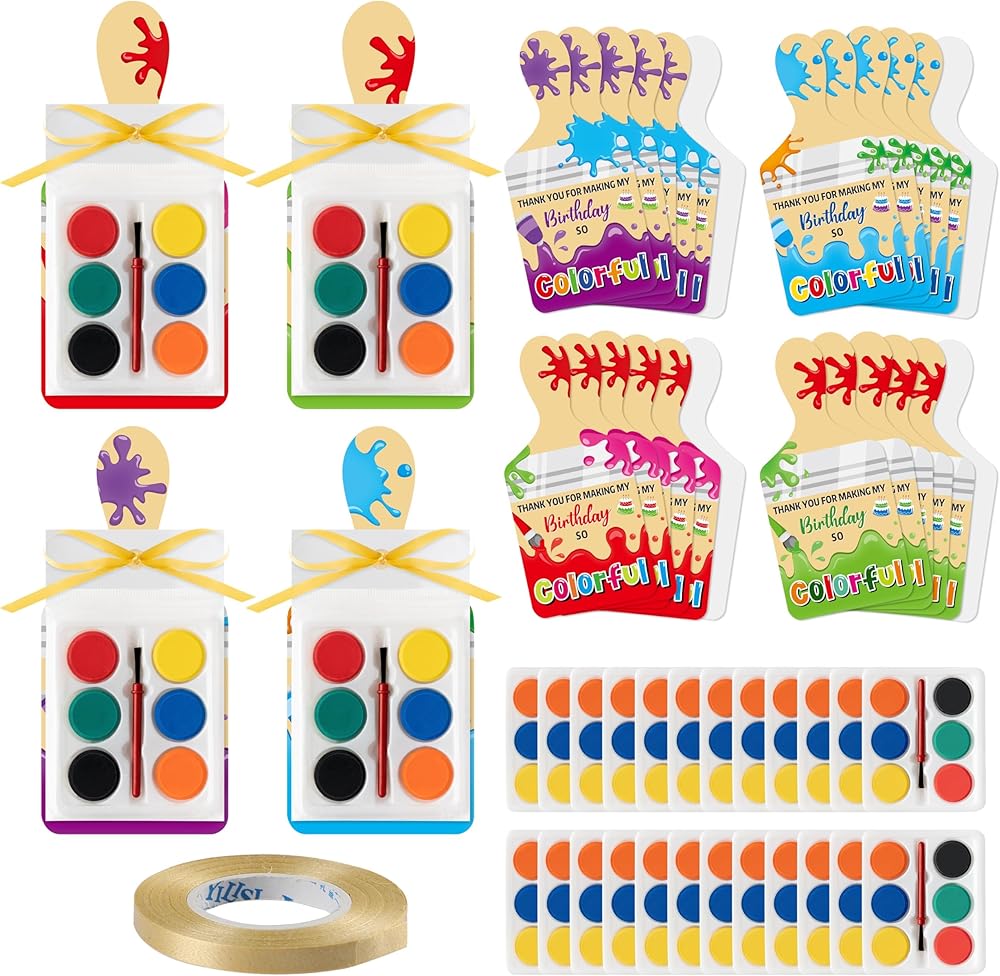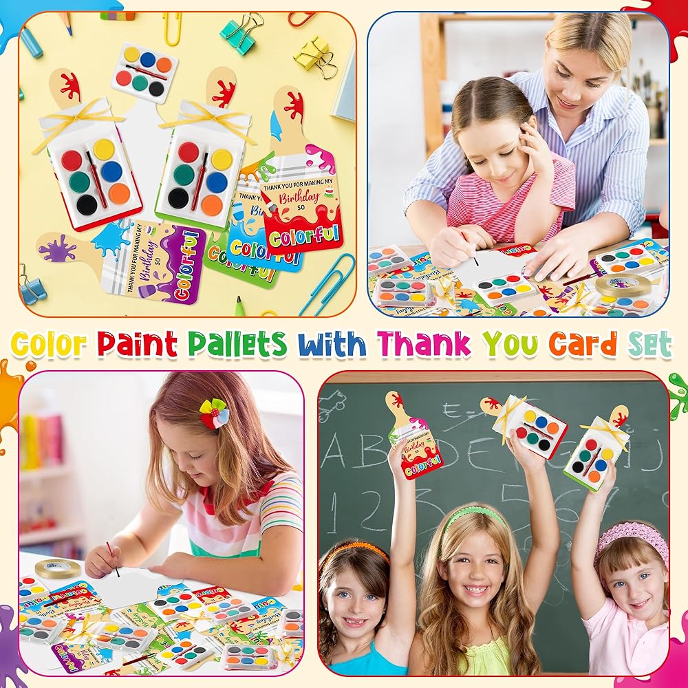 Rich Watercolor Paint Set: This birthday themed watercolor set includes 24 watercolor trays, 24 thank you cards (4 styles) and 1 roll of ribbon. There are enough styles and quantities to satisfy children's creative needs. Celebrate this holiday season with creativity and joy with our kids DIY kits!