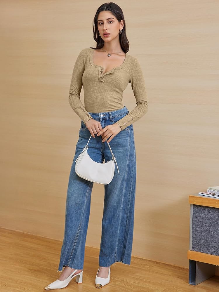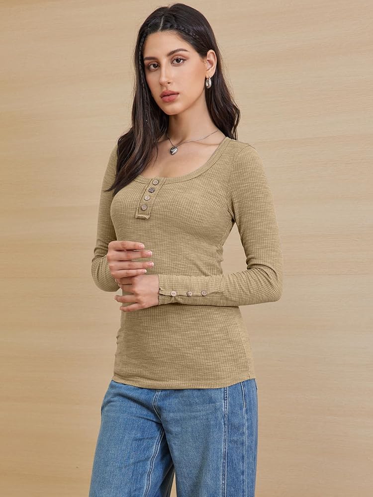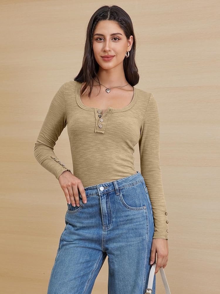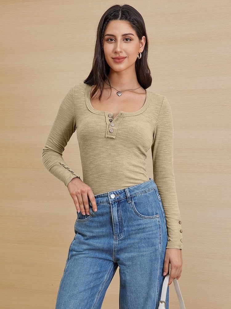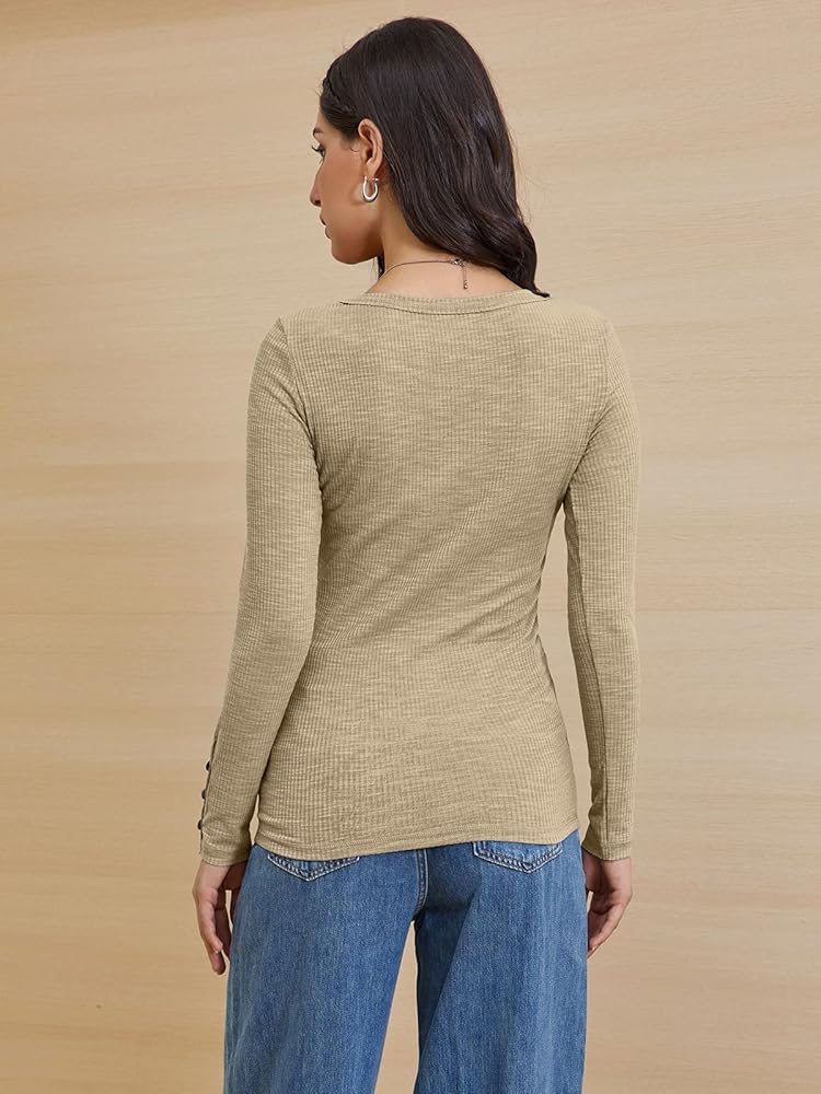 Design: Henley Long sleeve Top, Ribbed Knit Structure And Plain-colored Design, The Neckline Button Can Be Adjusted At Will To Create A Sexy V-neck Or Scoop Neck. Are All Further Eye-catching Details.