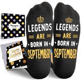 BIRTHDAY GIFT IDEA: The socks feature patterns of birthday cakes, gifts, and other festive elements at the top. At the bottom, there is a saying "LEGENDS ARE BORN IN OCTOBER".