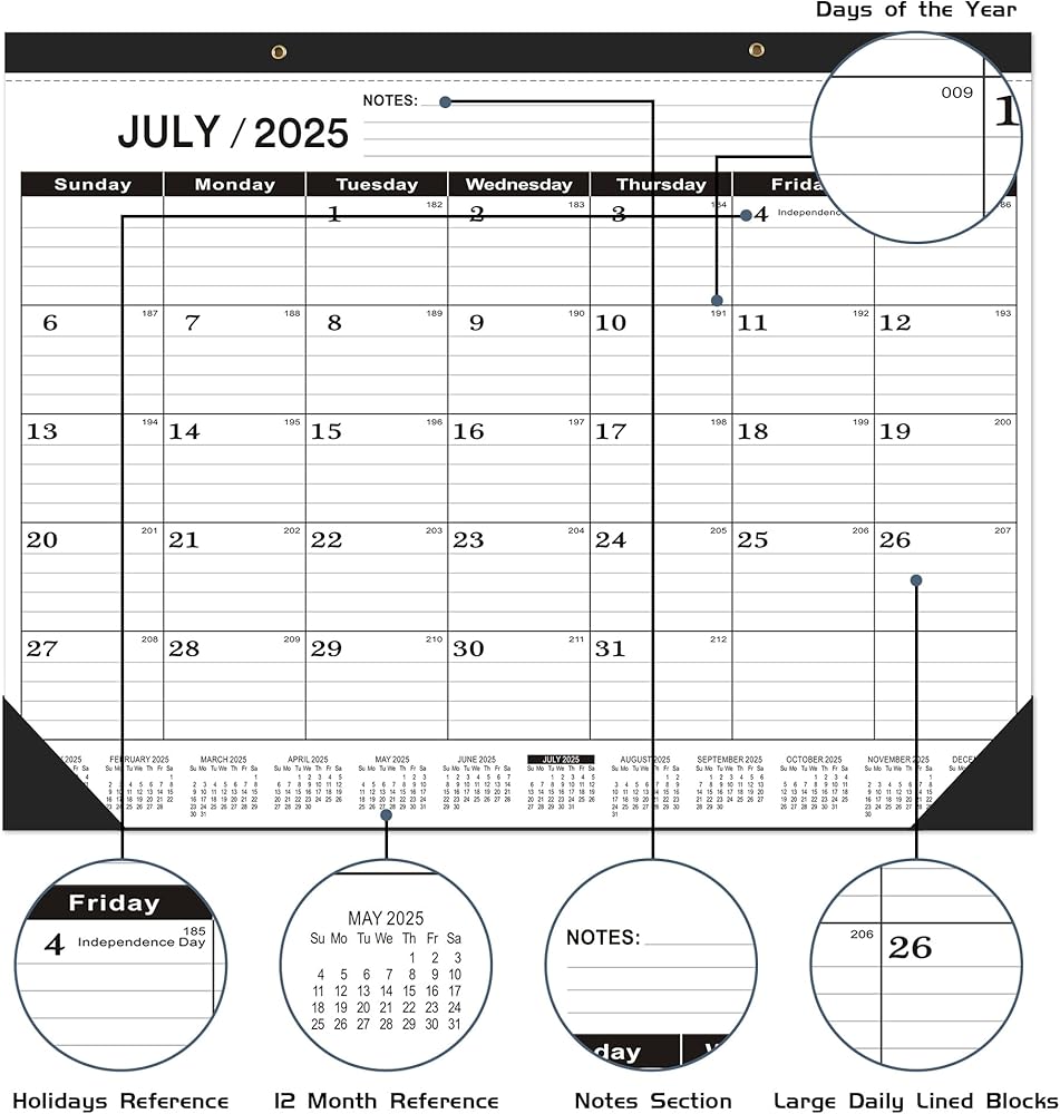 🔲【Feature Rich】2025 Desk calendar large 22x17 rigid backboard provides sturdy surface,perforated pages tear off easily,corner protectors hold pages in place.2025 Desk calendar 12 month mini overview calendar at the bottom is helpful for long-term planning.Day-of-the-year counters.The marked julian date and holidays will remind you of every important date.