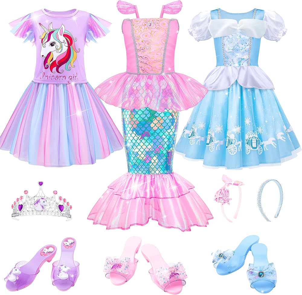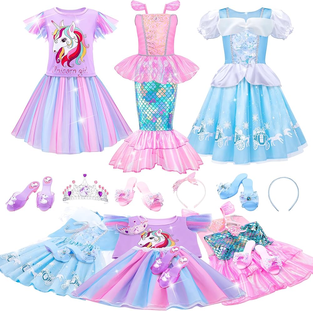 Stylish Girls Princess Dress Set is Great Birthday Gift Idea and Suitable for Many Occasions. The trendy toddler dress up clothes with princess heel shoes and accessories suitable for daily outfit and many dress up occasions such as birthday parties, Halloween costumes for girls, cosplay, Christmas, etc. Perfect birthday/Halloween/Christmas gift for little girls 3 4 5 6 7 8 years old.
