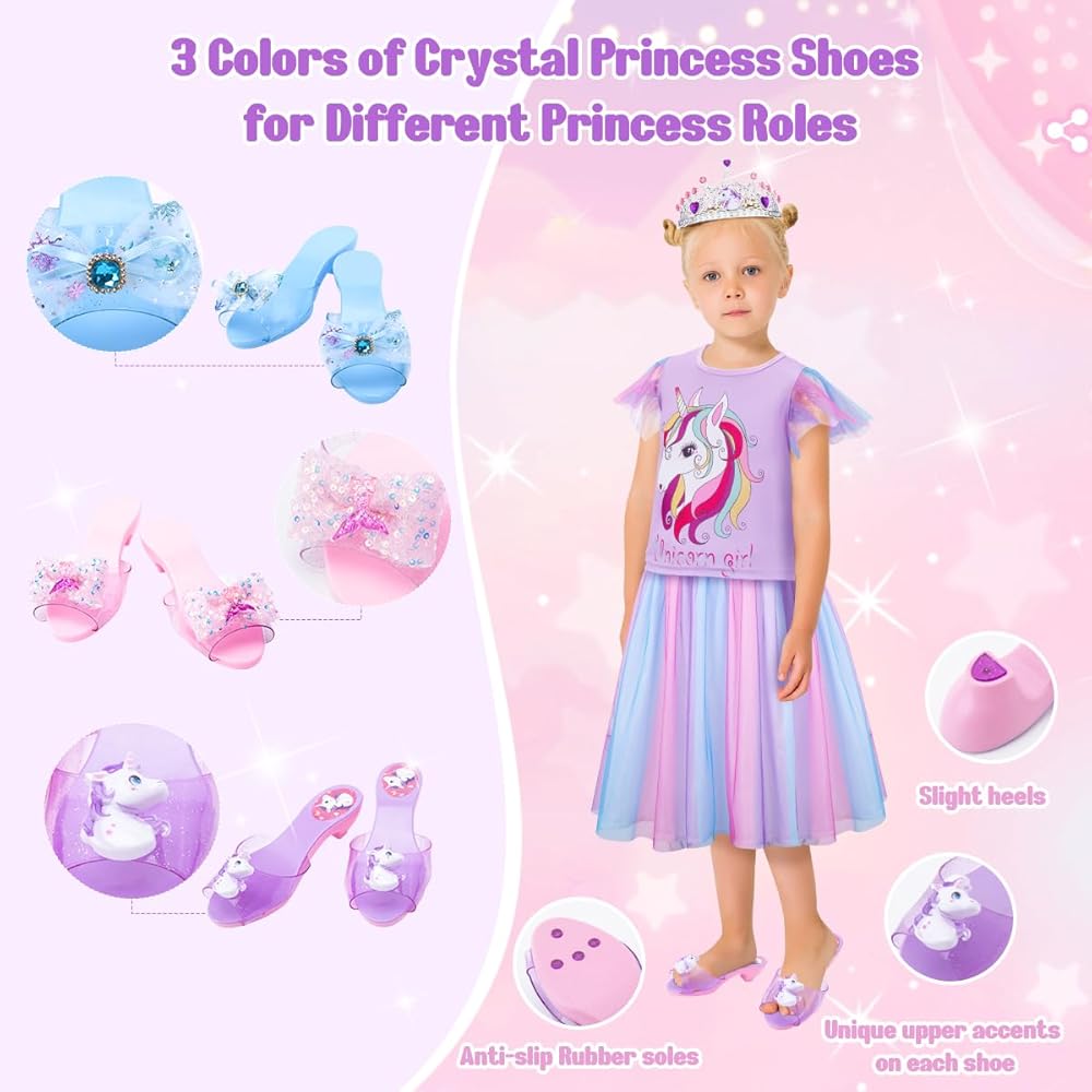 Durable Construction of Dress Up Shoes Combine Comfort and Fashion for Your Little Lady. Each pair of shoes matches the style and color of 3 princess dress, features delicate bow decor and princess character emblems on the uppers and non-slip rubber soles. Girls always enjoy picking her favorite color of shoes to match her princess outfit.