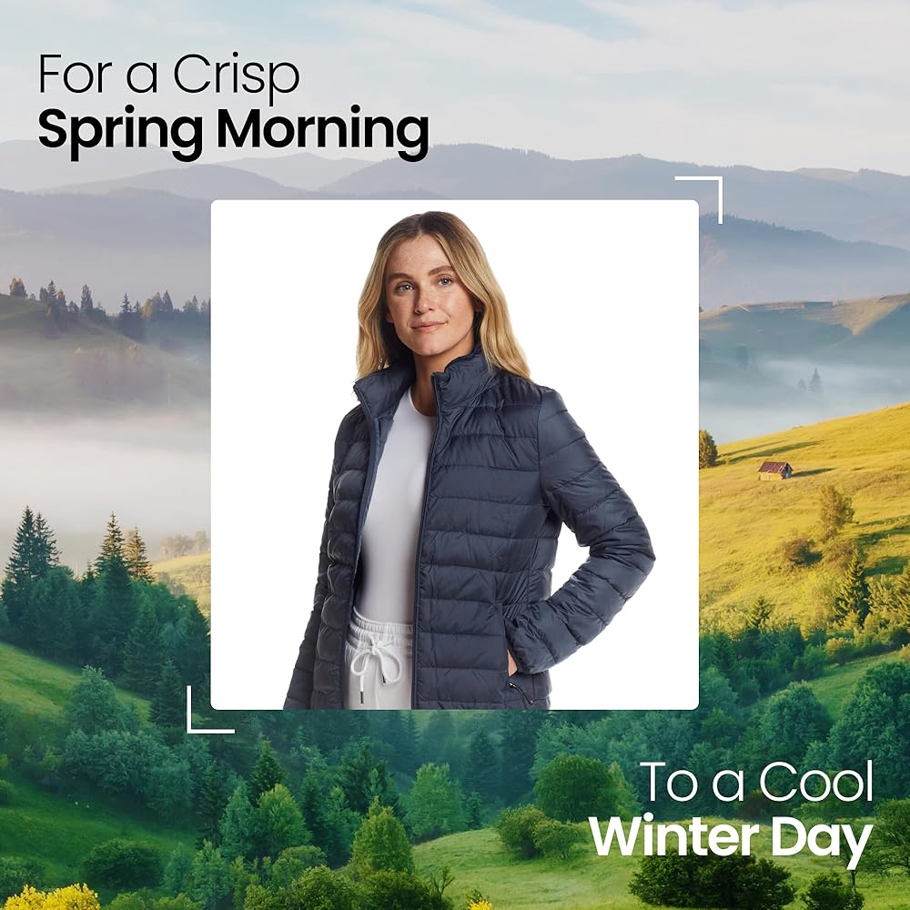 Warm & Lightweight: Crafted with a water-resistant cire shell and filled with lightweight alternative down insulation, this women's puffer jacket delivers exceptional warmth without the bulk. The quilted design ensures effective heat retention, making it perfect for crisp spring mornings and chilly winter days. Whether you're running errands or traveling, this jacket keeps you comfortably warm.