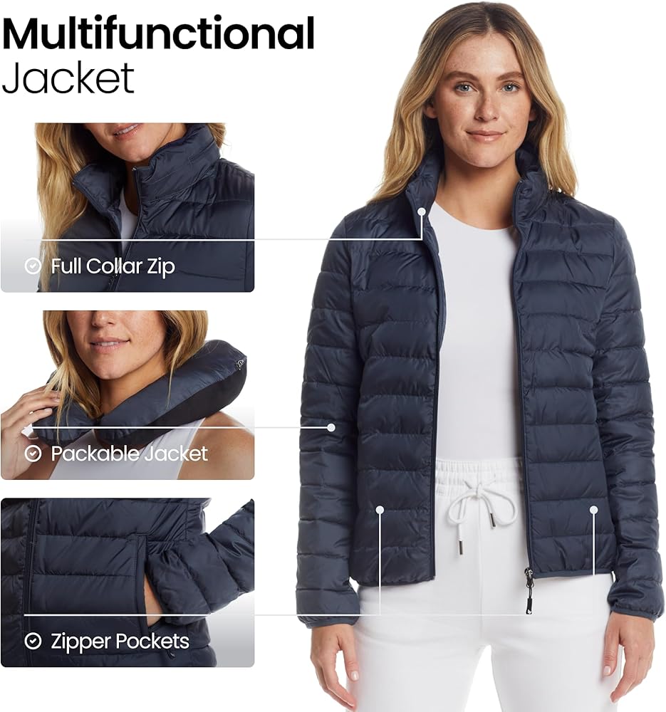 Pillow Packable Design: This versatile women's packable puffer jacket converts into a plush neck pillow using the built-in compartment in the collar. The jacket features a long zipper for easy packing and secure closure, making it an ideal travel companion. It attaches easily to your bag or can be worn around your neck for convenience, offering a unique blend of travel functionality and comfort.