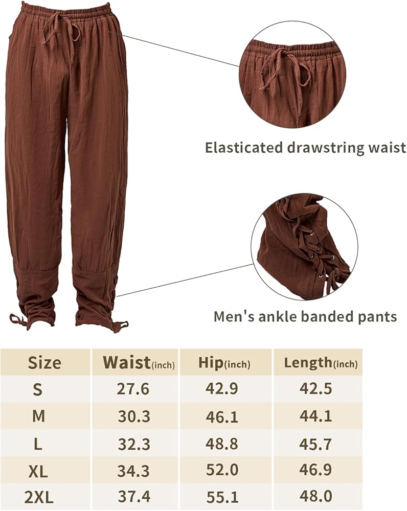 Nice Fit and Style:The pair of men's ankle banded pants creates the ideal halloween costumes men, with an elasticated drawstring waist for a nice fit and adjustable lace up ankles for easy sizing, our pirate bandana and sash are all made of linen, durable, lightweight, reusable