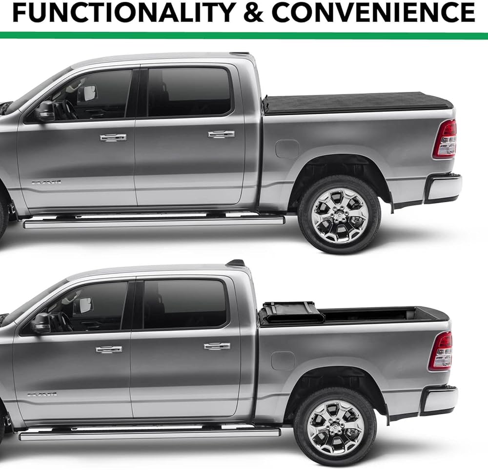 The Gator ETX Soft Tri-Fold provides convenient protection for your truck bed and its cargo at an affordable price. This soft fold truck bed cover can be installed in less than 10 minutes without the use of special tools, and without having to drill into your truck bed. Simply clamp the rails onto the truck bed and you're ready to go. The Gator ETX Soft Tri-Fold is constructed with a heavy-duty aluminum frame and cross-bows that support the tear-resistant, industrial-strength vinyl, providing a sleek look and feel that is built to last in any weather condition. Extra-strength sealing provides a tight seal around the perimeter of the cover and keeps rain, dust and snow out of your truck bed, protecting your cargo year-round. When you need to haul larger loads, you can drive with the cover in the 2/3 open position by folding it towards the cab and securing tightly with the integrated fastening buckles. The Gator ETX Soft Tri-Fold is proudly Made in the USA and comes backed by a lifetime, no-hassle warranty on the frame, and a 10-year guarantee on the tarp. If you experience any issues with your cover, our US-based customer support team is easily accessible and ready to help!.