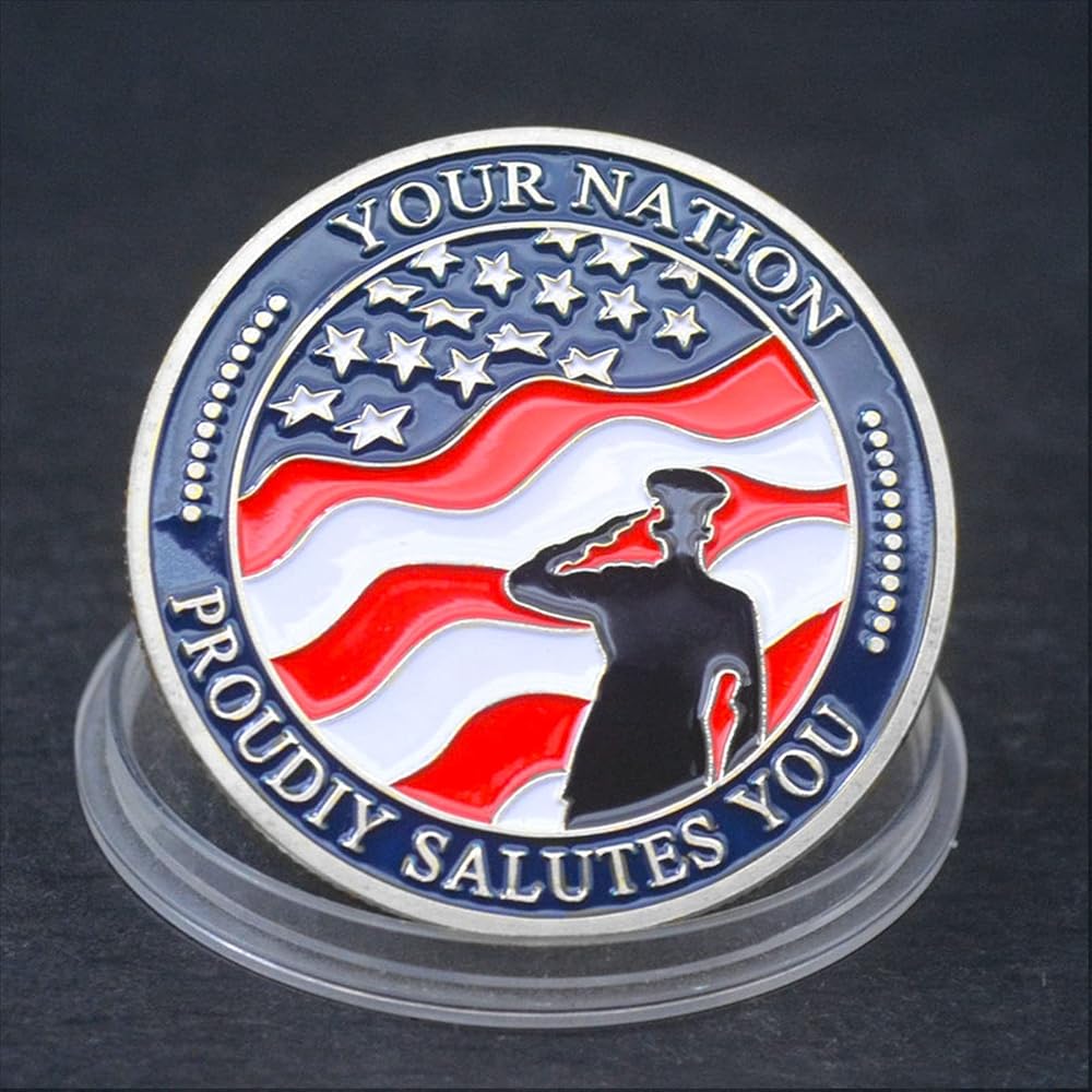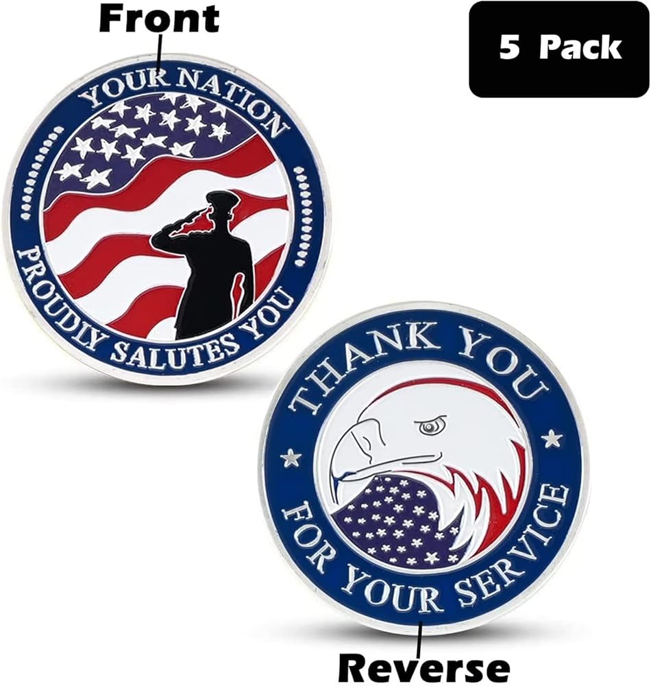 This 5 pack of 1.57" metal appreciation coins is a great way to recognize veterans. The unique Red, White and Blue full-color design featuring the classic national Flag and a lone soldier saluting.