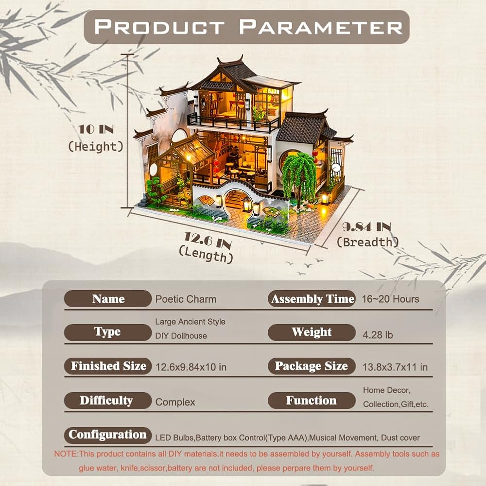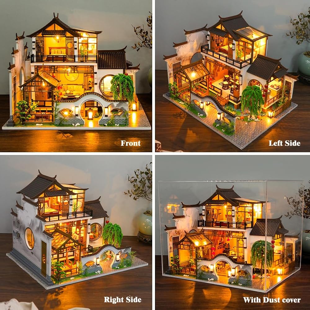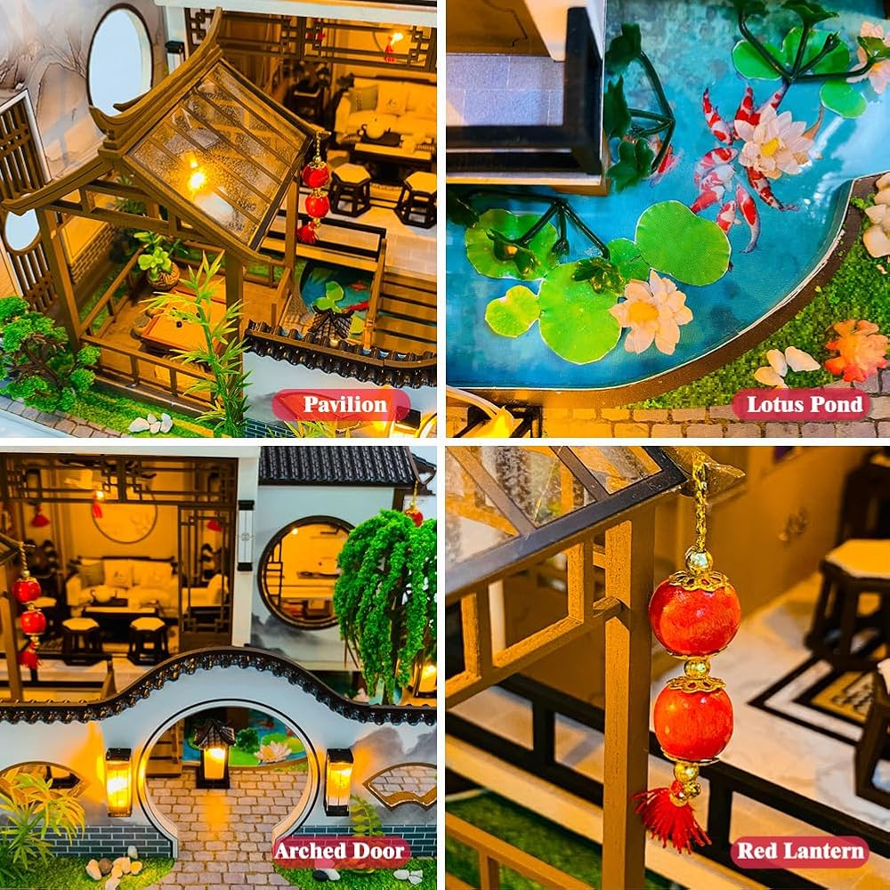 Yuzhen DIY Miniature Dollhouse with Furniture and LED Lights, Large Ancient Style Wooden Dollhouse Includes Dustcover and Music Movement, Exquisite Home Decor