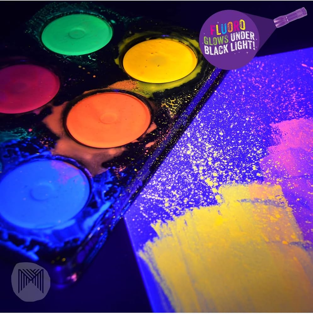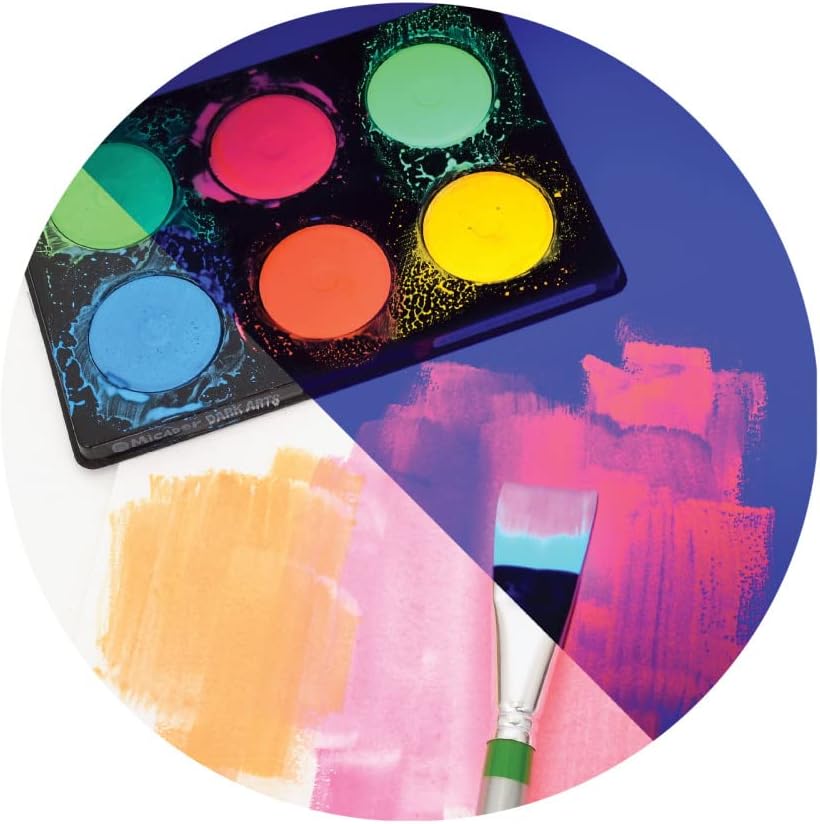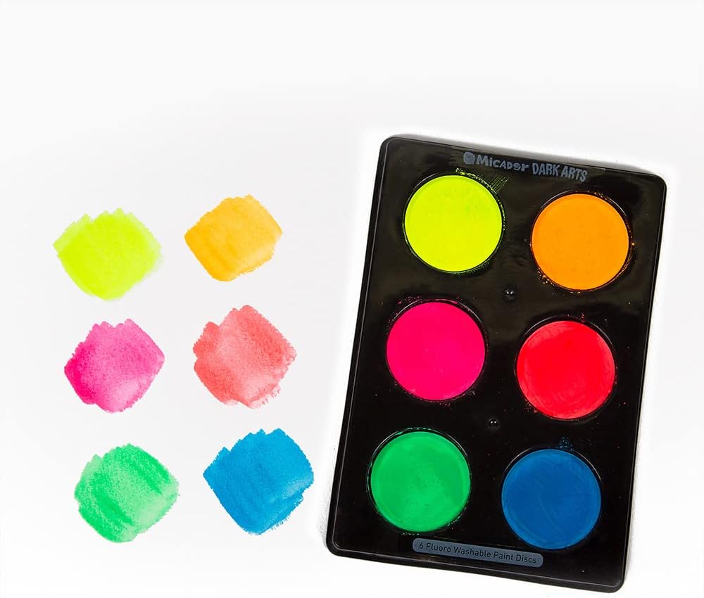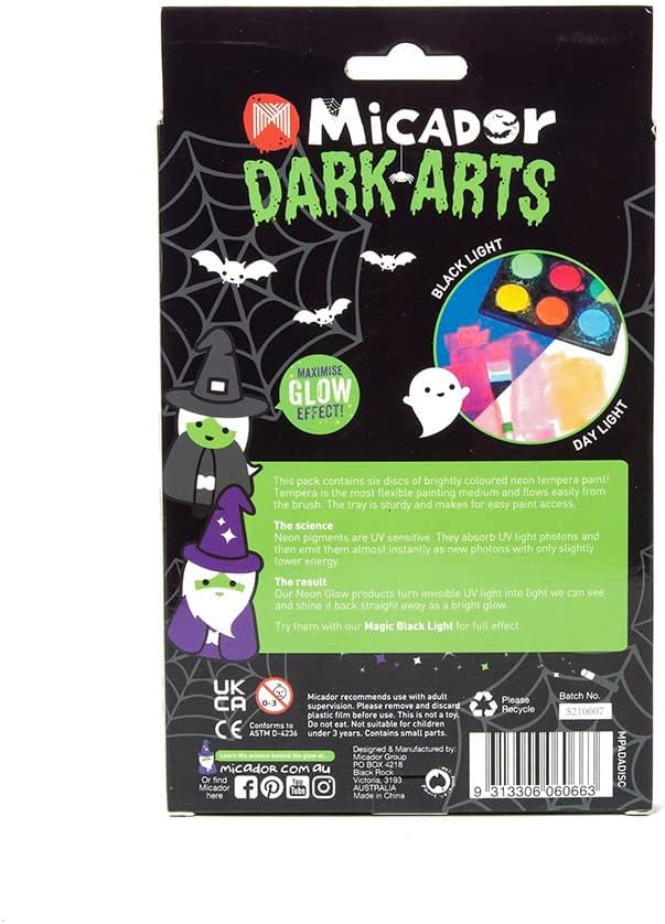 This Neon Glow tempera paint from Micador Dark Arts is housed in a sturdy tray for easy access. The paint flows easily when water is added. The set includes neon green, blue, red, orange, green and yellow paint discs. Tempera paint is ideal for children. They love the fluorescent effects when placed under the Dark Arts Magic Black Light. The 6 colors come on a palette and can be used to create spooky glowing designs.