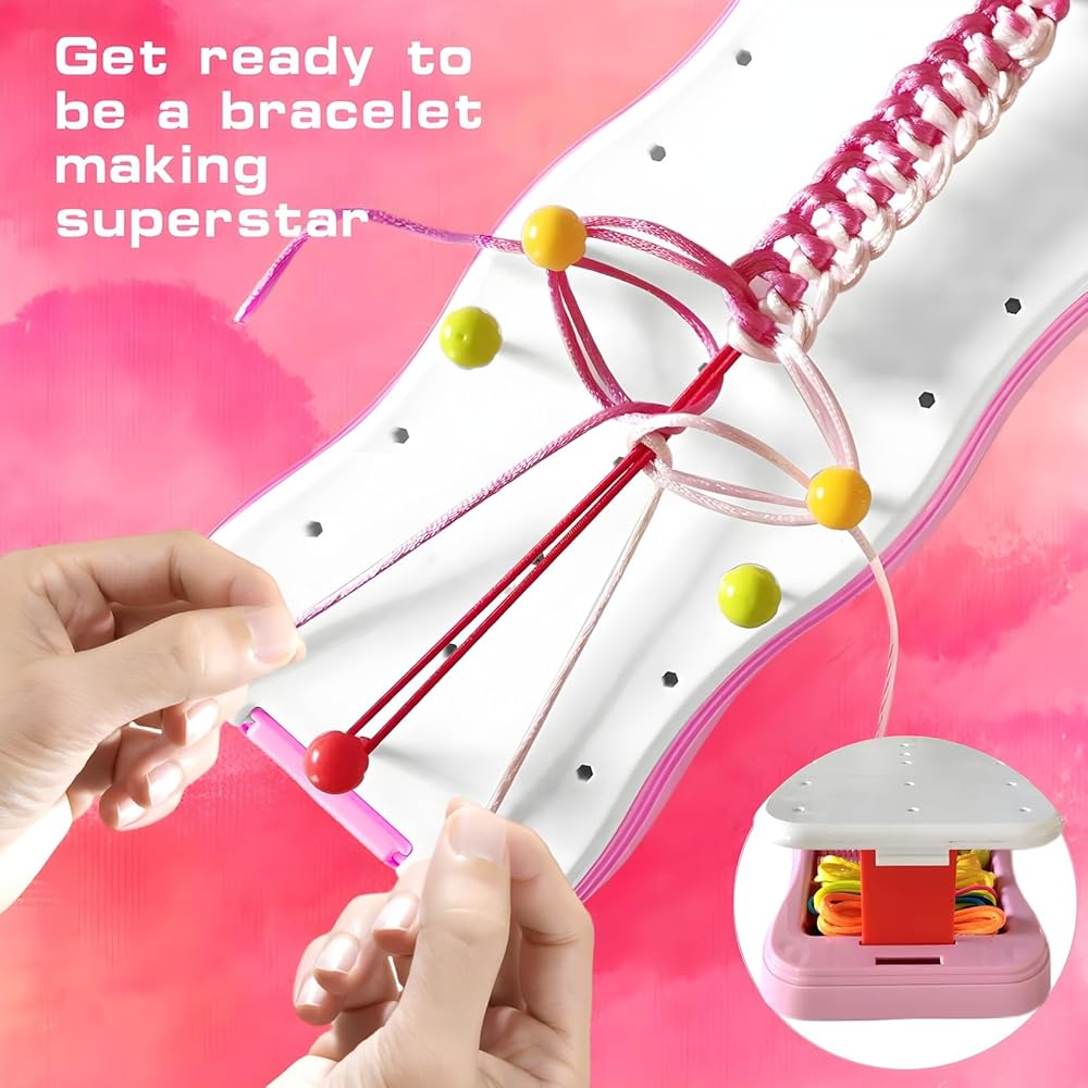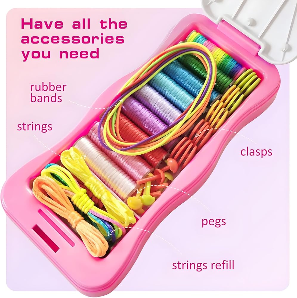 What's inside: The Friendship Bracelet Making Kit includes everything your child needs for endless creativity. It comes with1 portable bracelet loom, 10 colorful pegs, 18 bracelet threads, 10 sturdy elastics, 10 cartoon buckles, 10 fashion pattern stickers, 1 instructional guide,all conveniently stored in a beautifully designed case that doubles as a crafting board.