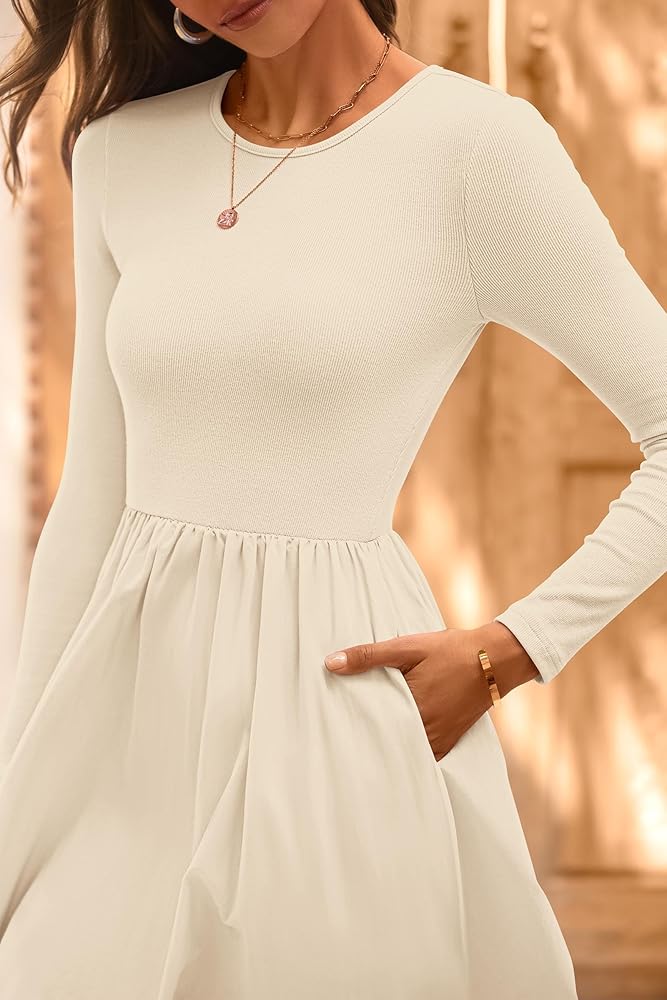 Womens Fall Fashion 2024: Enhance Your Wardrobe With This Long Sleeve Midi Dress For The Whole Year. Fall Dress-Fitted Upper Body Accentuates Your Curves While Flowing Swing Skirt Adds a Touch Of Liveliness. A-Line Design With An Elastic Waist And Round Neck Offers a Flattering Silhouette, And Has Practical Side Pockets.