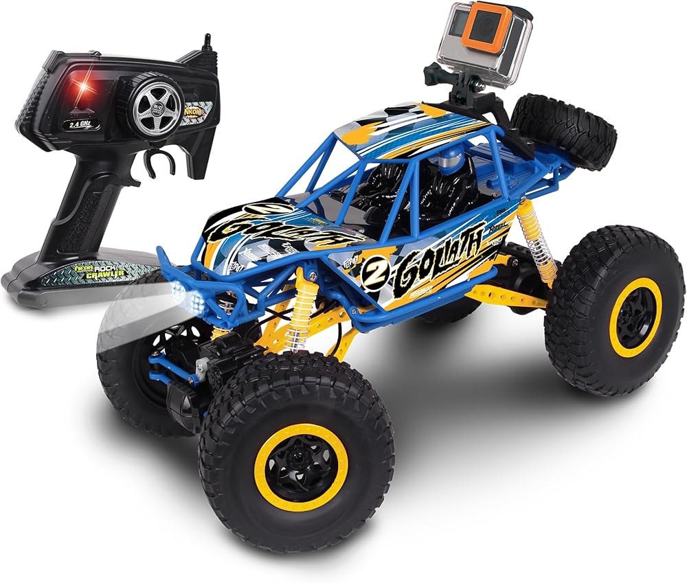The brand new Ready To Run 2.4GHz 1/10 scale Goliath Rock Crawler with Action Camera Mount features an innovative suspension system that allows for unparalleled rock crawling abilities! The motors are incredibly powerful and the tires are insanely grippy, yet the proportions of chassis to body are natural and beautiful. With a super rugged body, this rock crawler is ready to climb! Features headlights and an action camera mount (action camera sold separately).