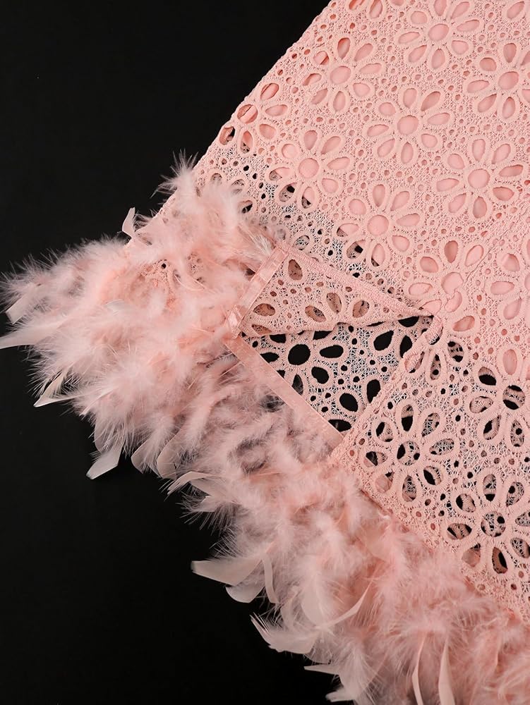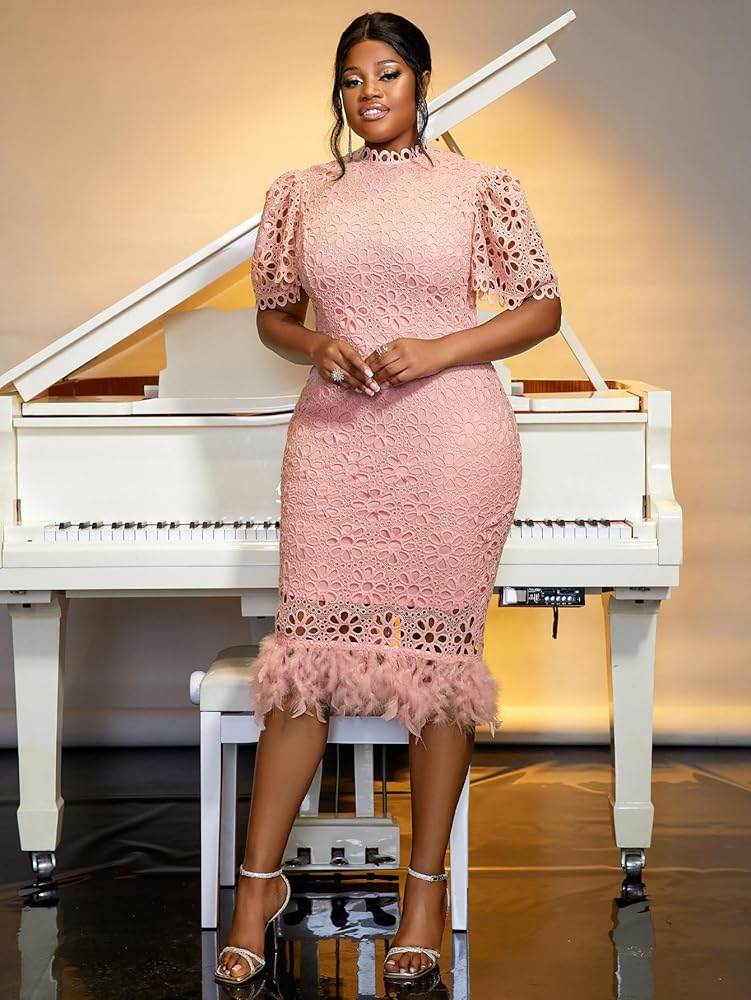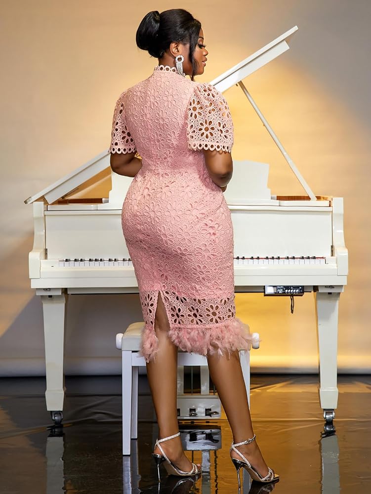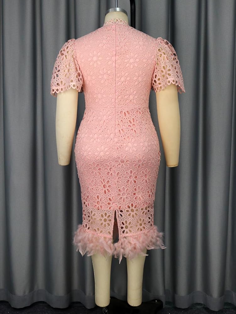 Features: Pink lace dress for curvy women plus size is elegant and dignified,featuring stand collar,hollow-out flowers,feather hem,puff Sleeve,back split,knee length.