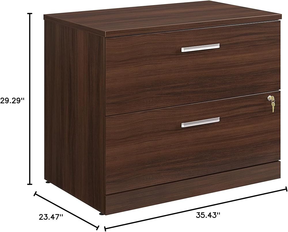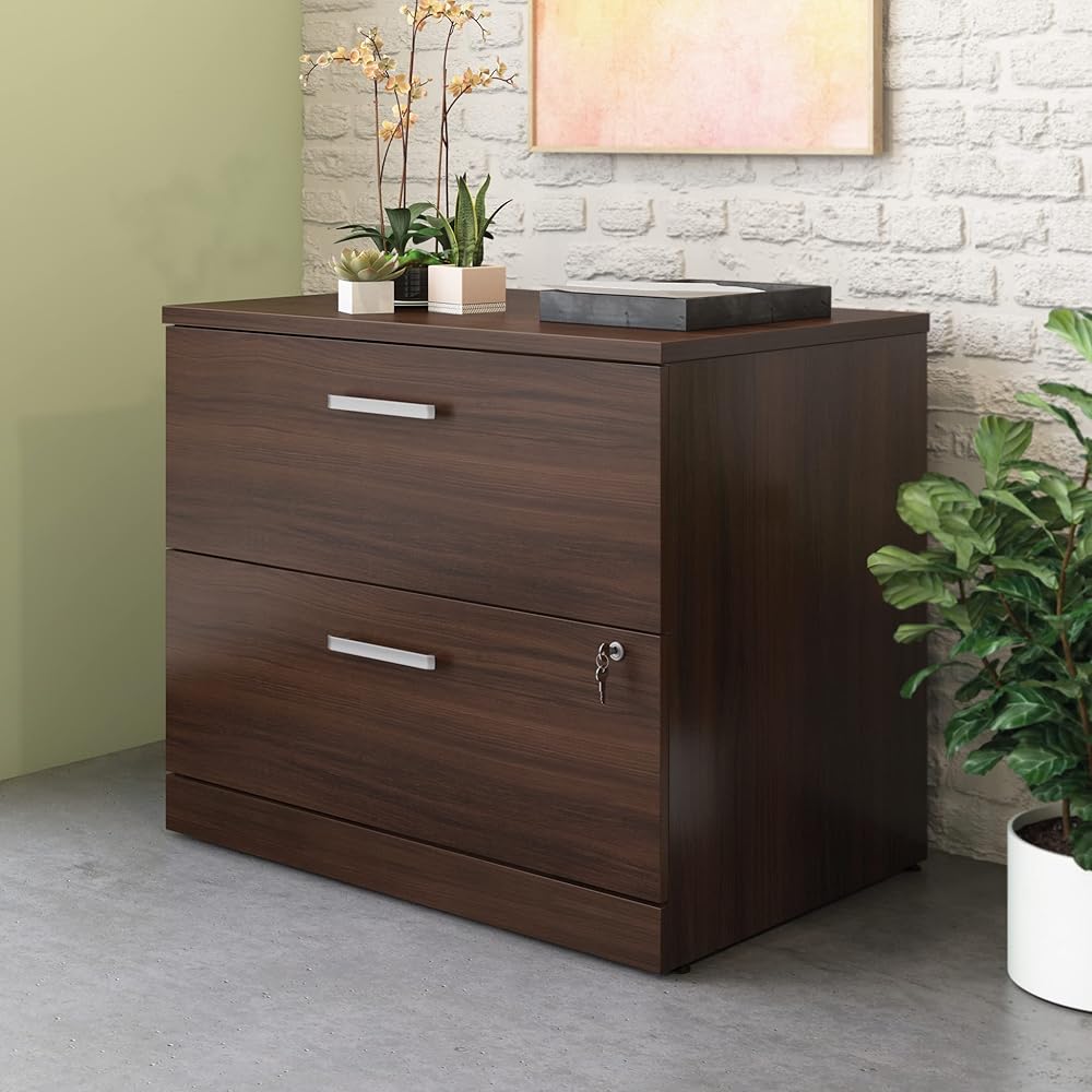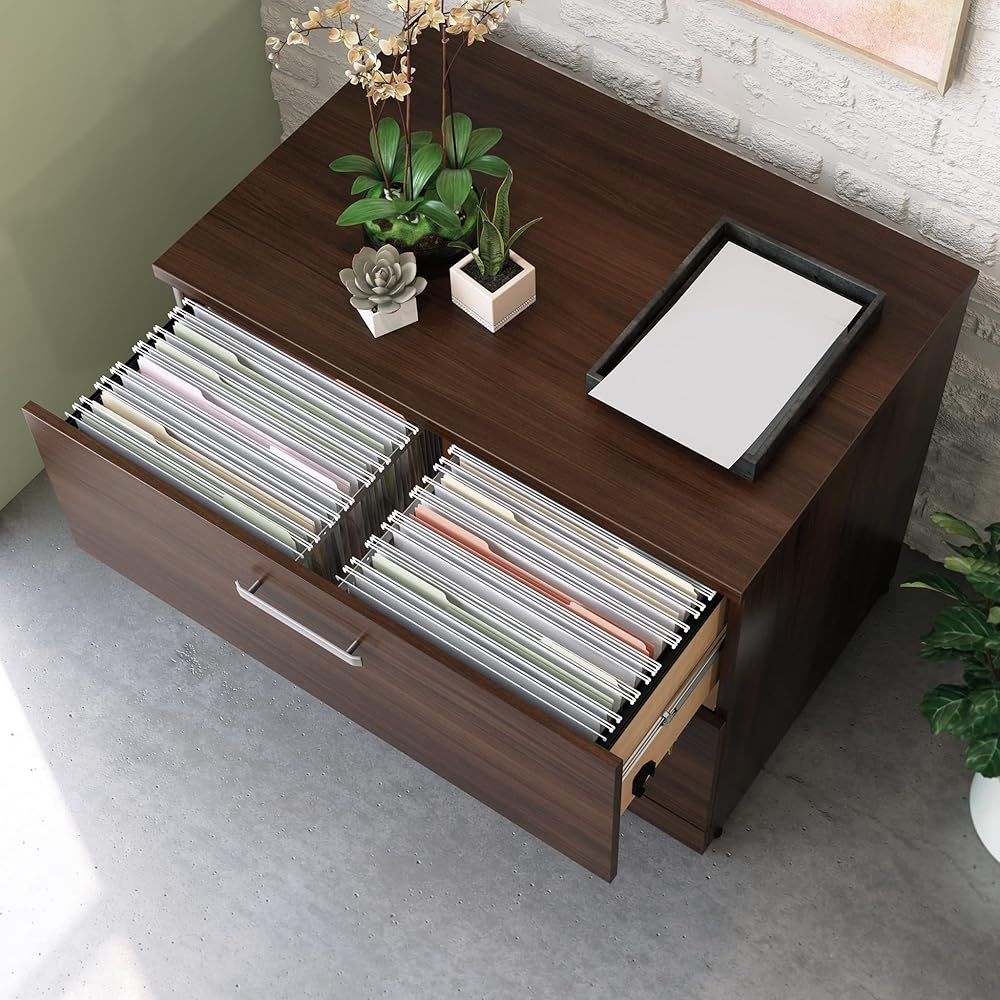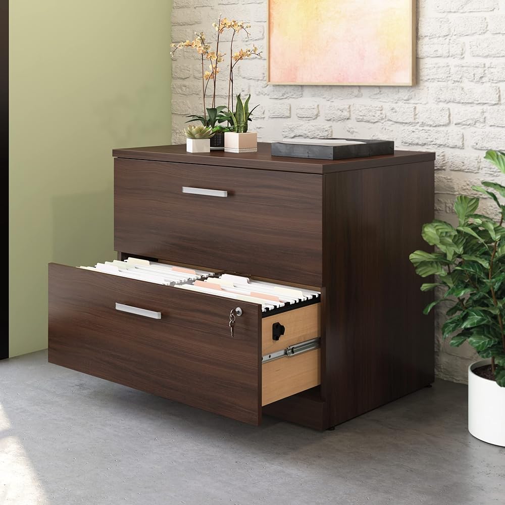 Find all the file space you need with this 2-drawer lateral file cabinet from the Affirm® collection. This commercial filing cabinet features a durable, 1" thick top with enough room for books, office décor, and a lamp. This lateral filing cabinet includes a melamine top surface that is heat, stain, and scratch resistant. Two drawers with full extension sides hold letter, legal, or European size hanging files. This lateral file cabinet includes an interlocking safety mechanism that allows only one drawer to open at a time. You can guarantee the security of your most important documents with a key lock on this 2-drawer filing cabinet. Commercial filing cabinets that are finished on all sides, like this one, allow for versatile placement and a polished look from every angle. Adjustable levelers at the base of this commercial office storage furniture provide precision and customization no matter how you arrange your office. Finished in Hudson Elm™, this file cabinet offers storage space for the most intense file hoarders.