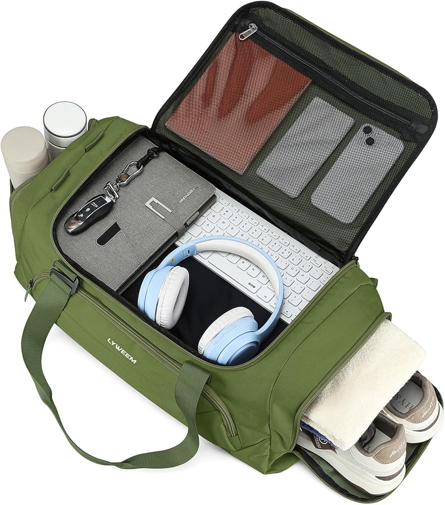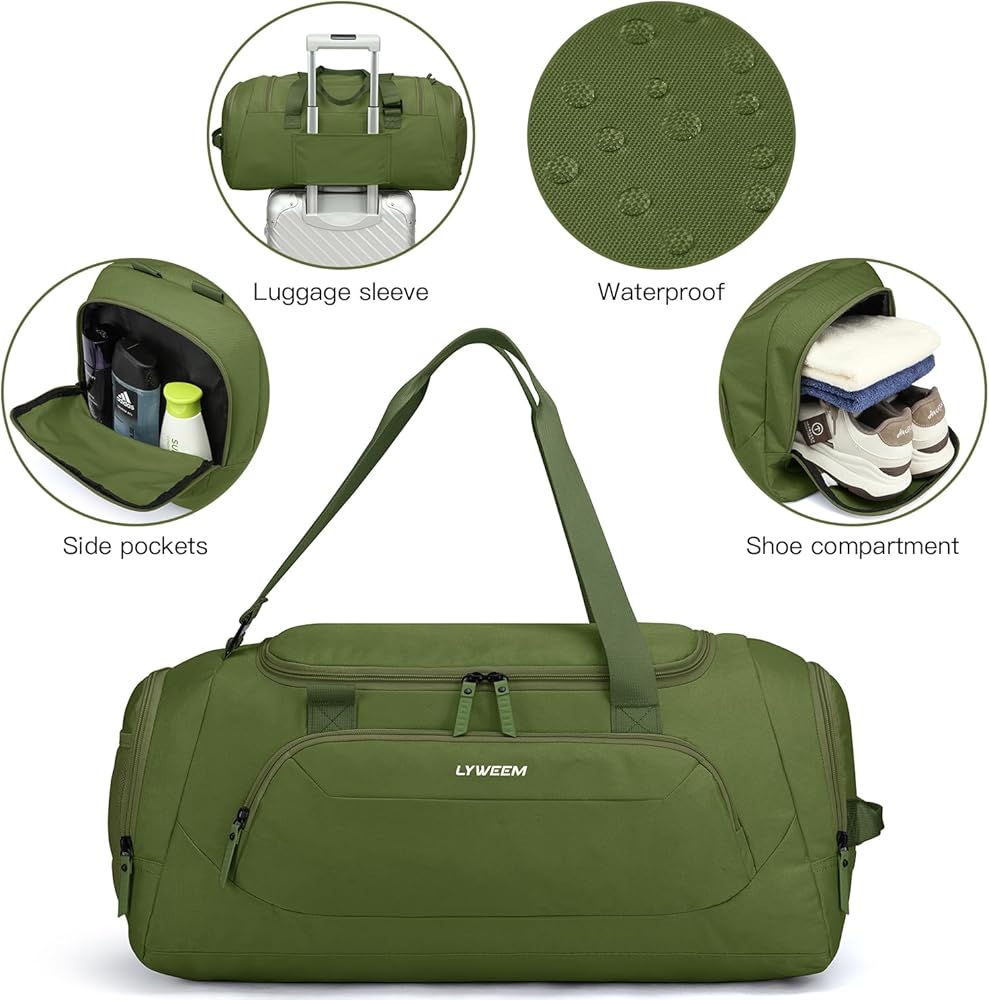 【Multifunctional】Lyweem duffle bag backpack has a total of 6 pockets. Includes 1 large internal mesh pocket and 1 internal zipper pockets; Outside: 1 front Wet pockets, 1 shoes compartment, 1 trolley luggage sleeve, and also equipment a keychain.
