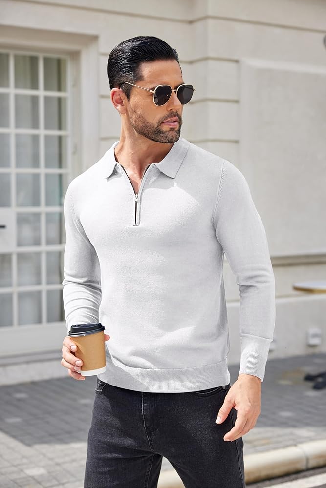 【Easy To Match】For a casual everyday style, these mens sweater polo can be paired with jeans, jackets, or khakis. For a business look, it can be matched with blazers, trench coats, or dress pants. This lightweight polo shirt is perfect for fall and winter outfits.