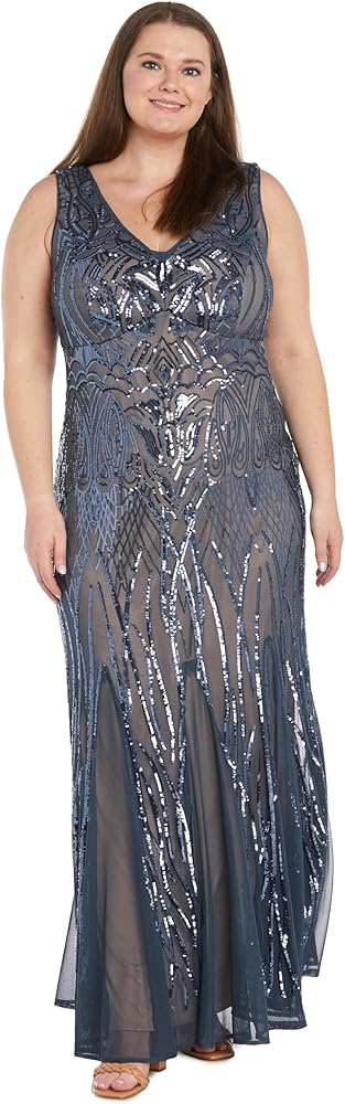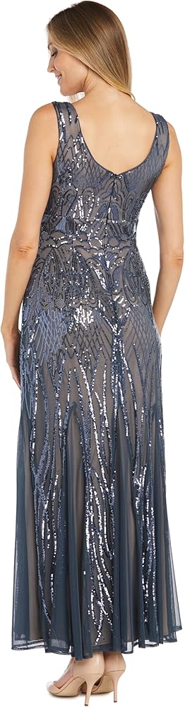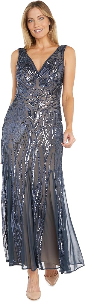 R&M Richards Women's Luxurious Sequin Embellished Gown | V-Neck Formal Beaded Maxi Dress W/Contrast Lining & Godet Skirt