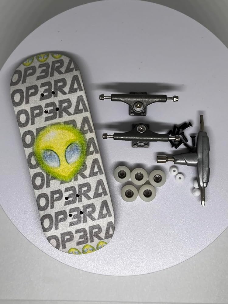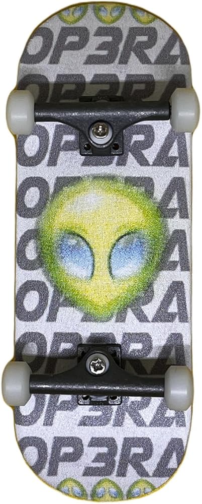 Desc.:The Pro Premium fingerboard complete set,Op3ra-The Alien Area51 Edition includes the Handmade maple wood 5 Plys, Using Quality UV printing graphic with The Alien Area51,which included 5 Pcs Polyurethane bearing wheels in ivory and one more pro bushing for replace,The pro solid single axles trucks with laser Op3ea logo and self Lock Nuts in Nylon Inserts upgraded, 10 black screws, 1 pro tool, 1 grip tape,1 free Op3ra sticker.Deck measures 34mm wide and is 96mm long. Fetures medium kicks and medium concave. Handmade drilled holes on deck to ease your install.
