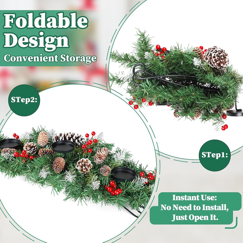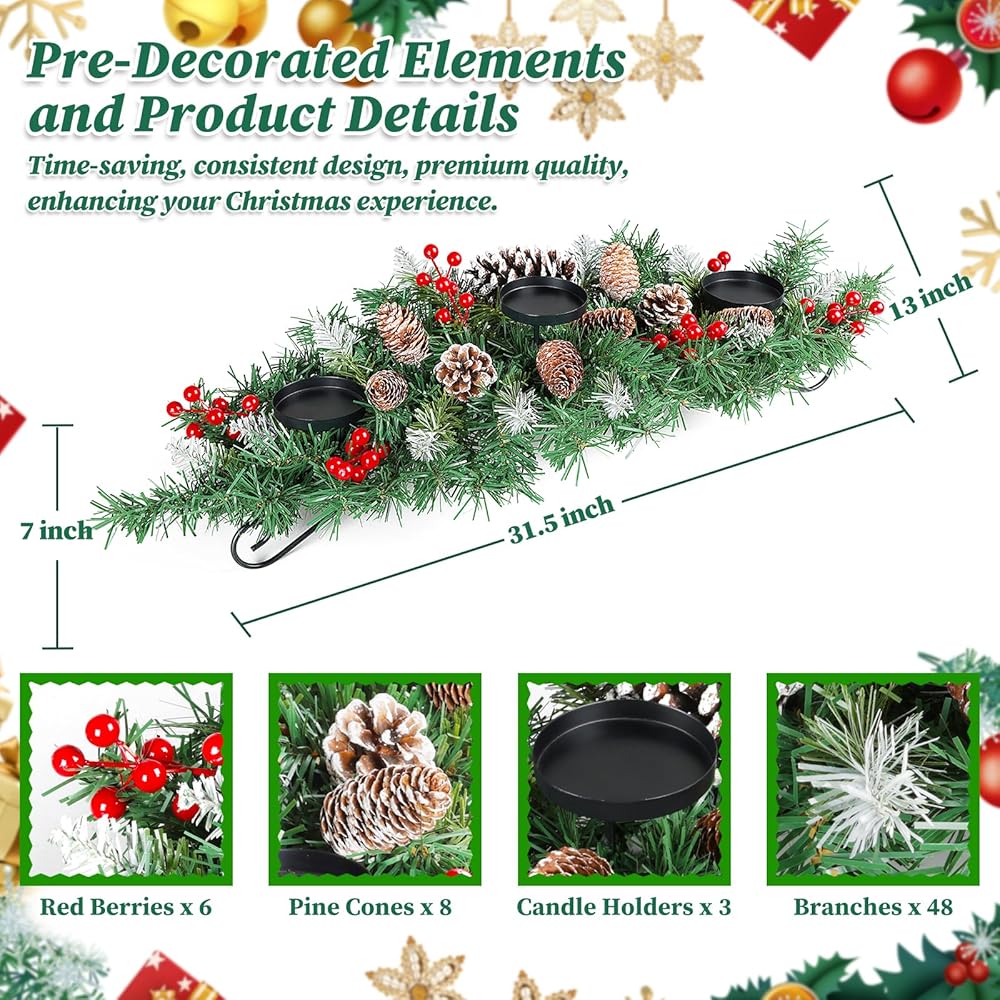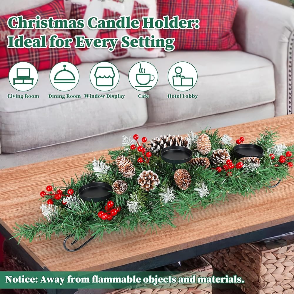 31.5" Christmas Centerpiece with 3 Candle Holders, Artificial Table Decorations with Pine Cones/Red Berries/Steel Base, Christmas Decorations Indoor, Xmas Tabletop Decor for Festival Home Decoration