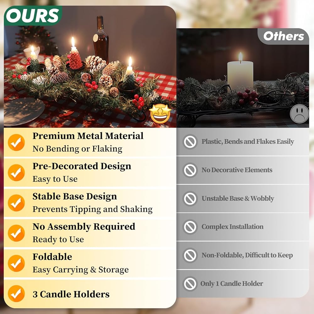 Premium Made for a Safe & Merry Christmas: Craft from premium metal and adopts double - row design, this centerpiece with candle holder providing a secure and stylish display option for your candles, no tilting. The durable construction ensures long-lasting use, making it a perfect addition to your festive decorations as well as reducing the need for second purchases. Warm tips: Keep away from flammable materials and never leave unattended when using lit candles.