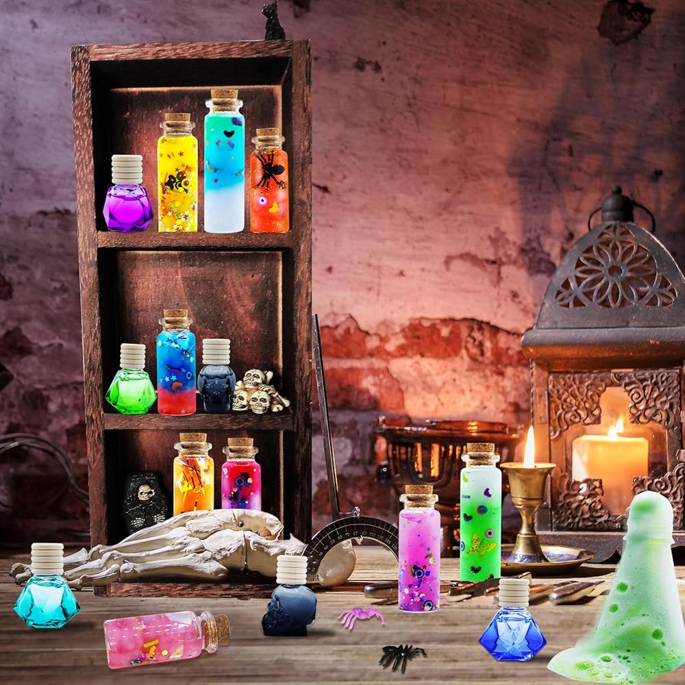 Potion Making Kits for Kids: The package contains a apothecary box with 15 mini glass bottles with cork, a conical bottle, 6 irregular bottles,3 Color water, fairy wings, witch headband, unicorns, mini spider, magical stirring spoon, funnel, magical potion guide book and other magical items to inspire endless imagination in your little Wizard. Make apothecary bottles in the style of Halloween horror.