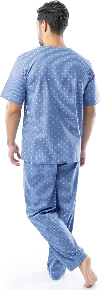 These quality pajamas will keep you cool and comfortable. Constructed with easy care fabric, these pajamas are soft and smooth. The V neck styled top features a button front and patch pocket. The pants have a covered elastic waistband with an adjustable button closure and button fly.