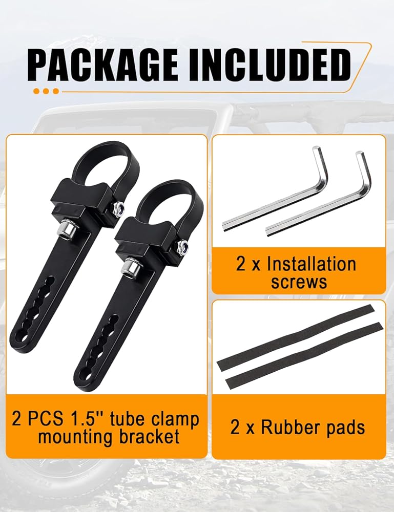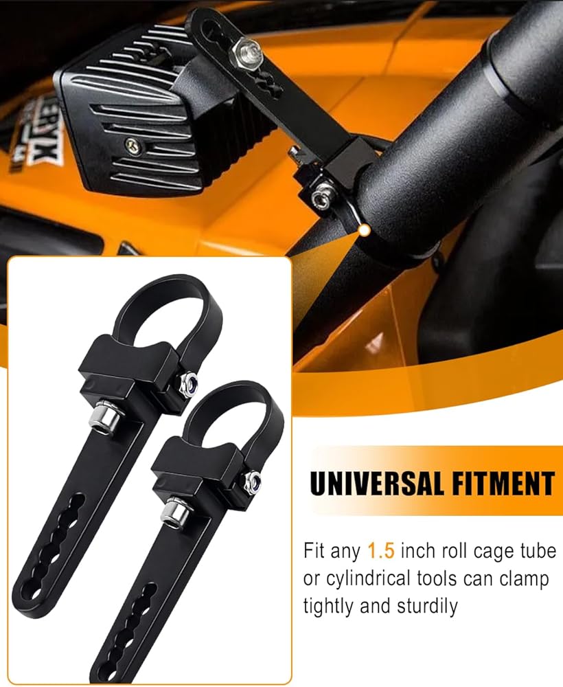 🎈UNIVERSAL FITMENT🎈 Please make sure the tube clamp mounting brackets fit your vehicle before you purchase, tube clamp roof roll cage holder can work with most LED/HID/halogen light bar,spot/fog light,driving light with 6mm/8mm mounting bolts etc.