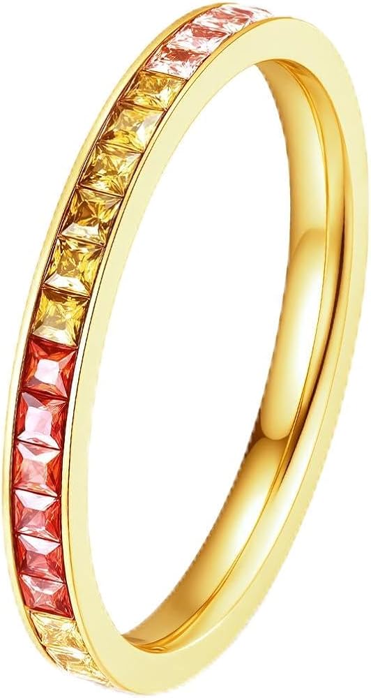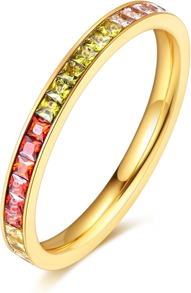 Rainbow Stone Eternity Rings for Women, 14K Gold Plated AAAAA Cubic Zirconia Multi-Gemstone Stackable Band Ring