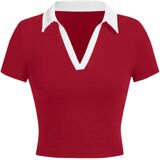 Collared V Neck Crop Tops Color Block Short Sleeve Polo Shirts for Women Ladies Casual