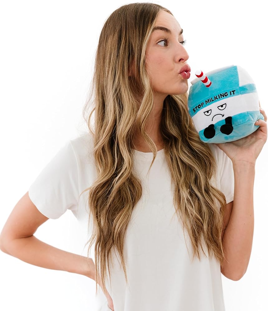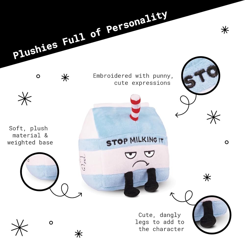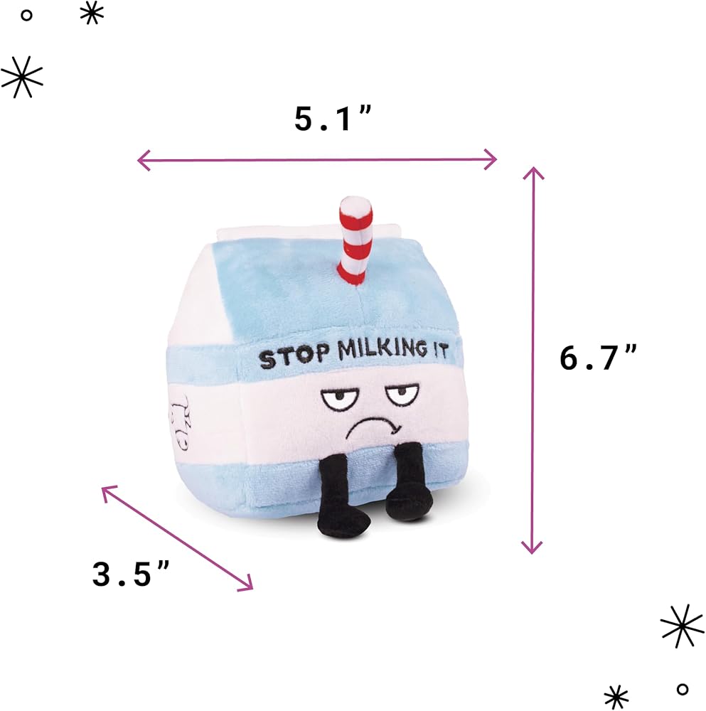 SALTY HUMOR Some folks just don't know when to stop and get off the woe-is-me train. Enough with the sour milk! Carton plushie has an annoyed face, striped straw, and the embroidered message “STOP MILKING IT”. Sit him on your office desk to remind folks you don't want to hear it anymore.