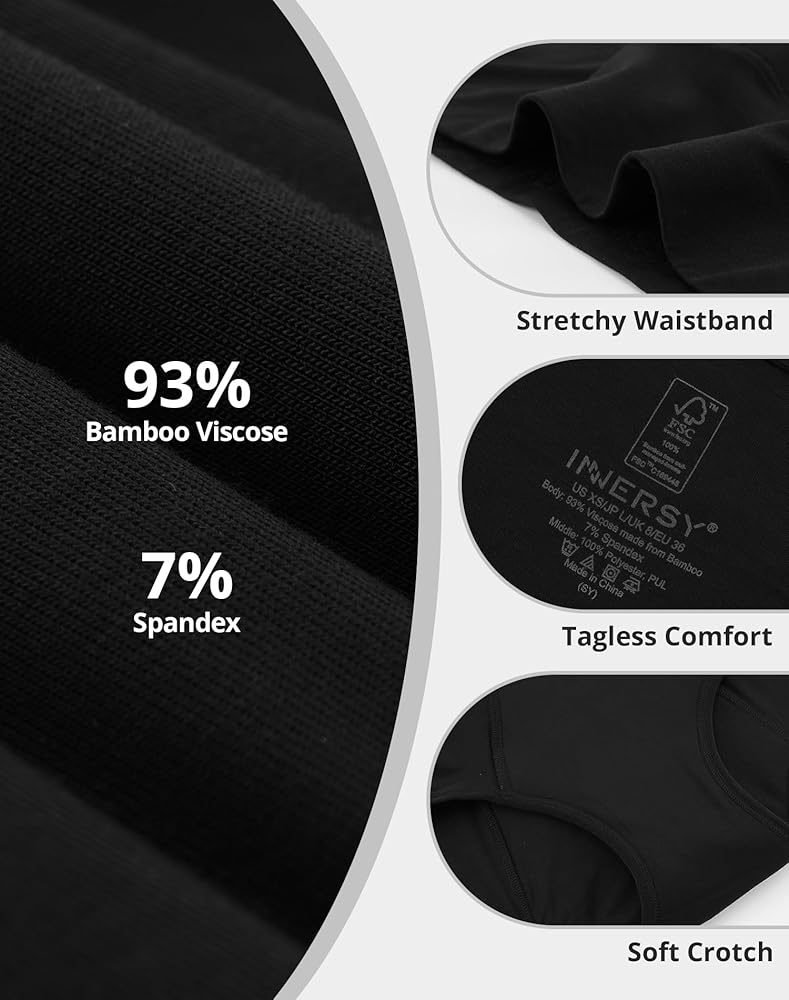 Breathable Fabric: Crafted with 93% bamboo viscose, these women's period underwear are soft, breathable, and gentle on the skin, ensuring all-day comfort. These leakproof underwear efficiently wick away moisture and sweat, ensuring women stay fresh