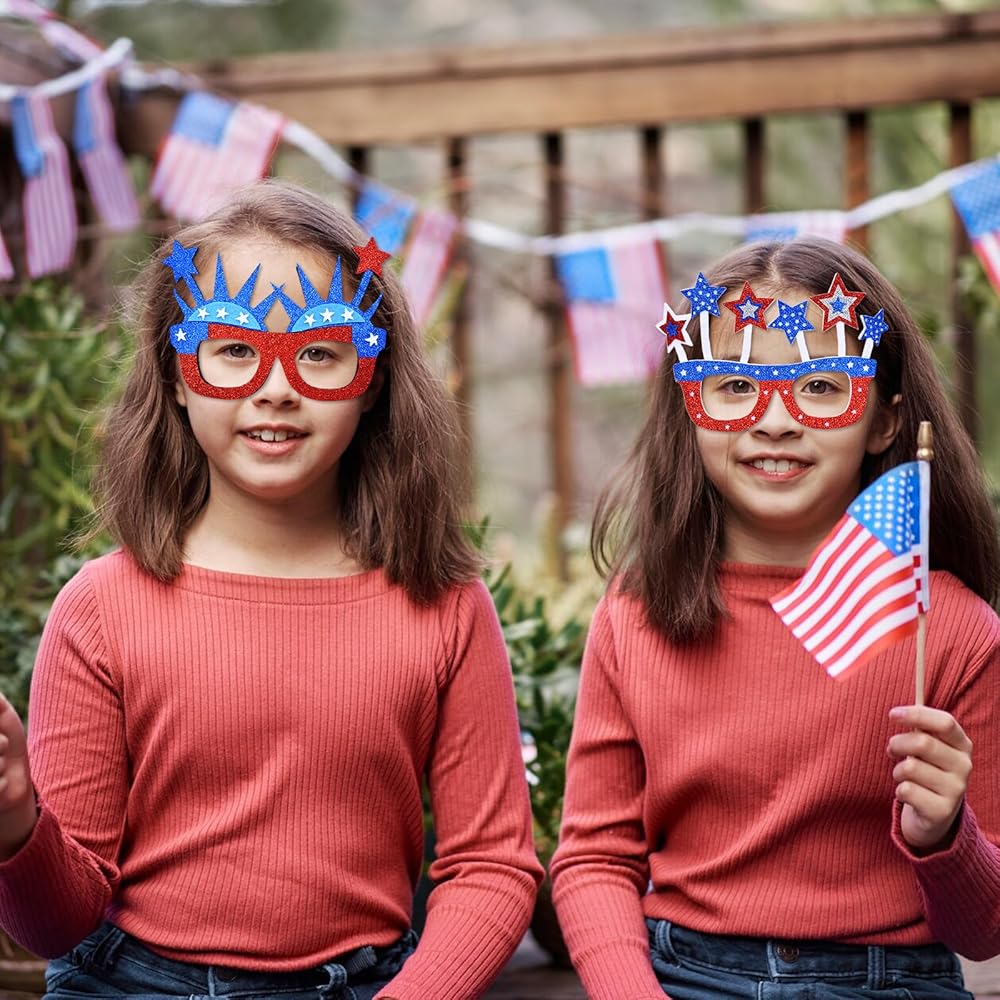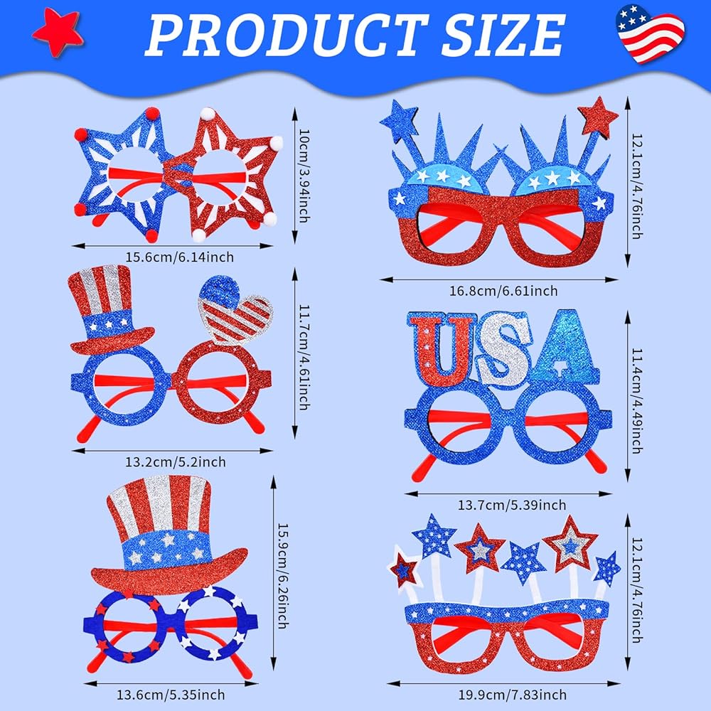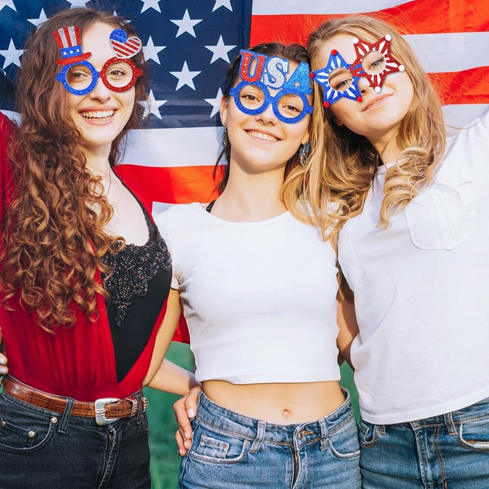 6 Pcs 4th of July Glasses Party Decor, Glitter Party Sunglasses Frames Novelty Costume Eyeglasses Photo Props for Adults, Independence Day Decorations Fun Holiday Party Favors, Memorial Day